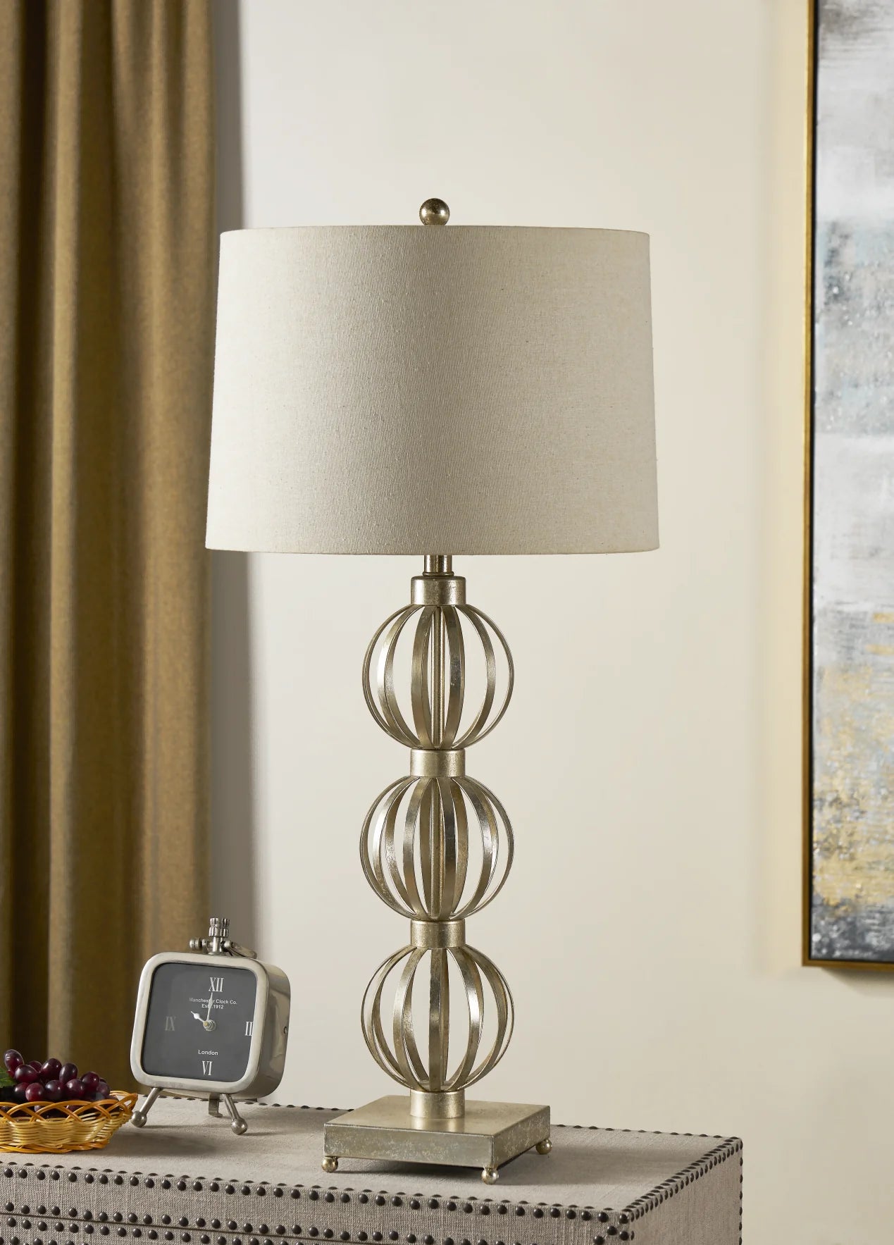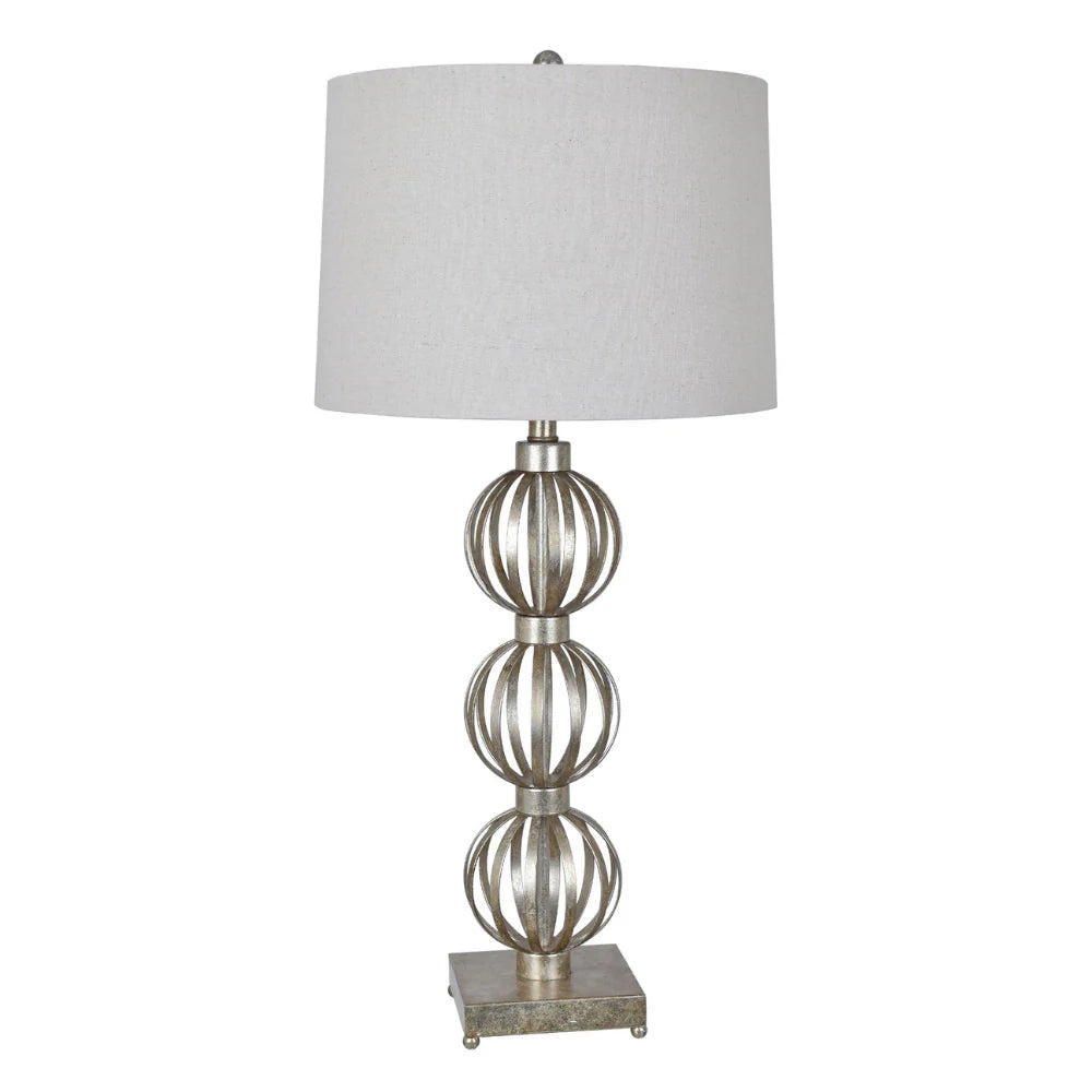 The Massoud Table Lamp features three ornamental spheres stacked on top of one another, sitting on top of a square base. The metal construction features a silver finish beautifully complemented by the natural linen drum shade. The transitional, yet traditional style of this lamp allows it to blend with any decor.