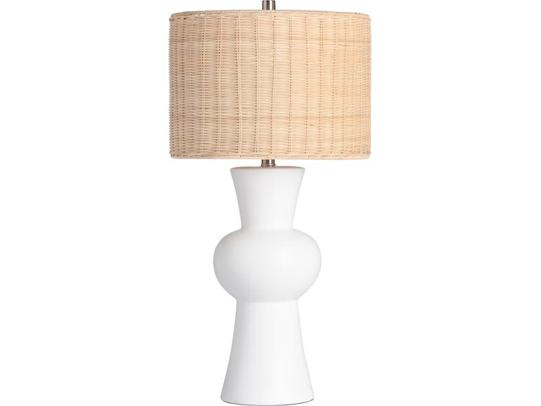 The Mendocino Table Lamp features a sophisticated matte white glaze over the ceramic bulb shaped body, but the crowning feature is its' natural wicker drum shade. Perfect for a sophisticated coastal sanctuary.