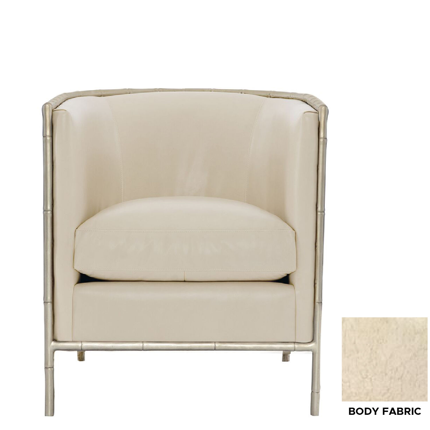 A bamboo-style exposed frame in French Silver finish adds a unique, organic glamour to this elegant barrel back chair.