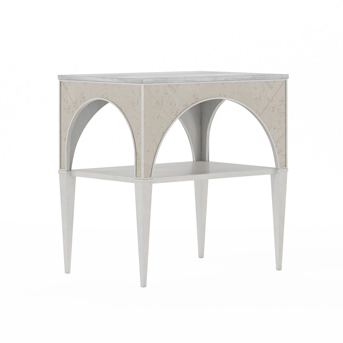 This petite night table combines the elegance and grace of the arches of Paris with the glamorous elements of antiqued mirror and a luxurious stone top. A light, open frame finished in dove gray makes this architecturally inspired bedside piece feel airy rather than solid, and a fixed lower shelf offers just enough space for books, baskets, or any other necessities.