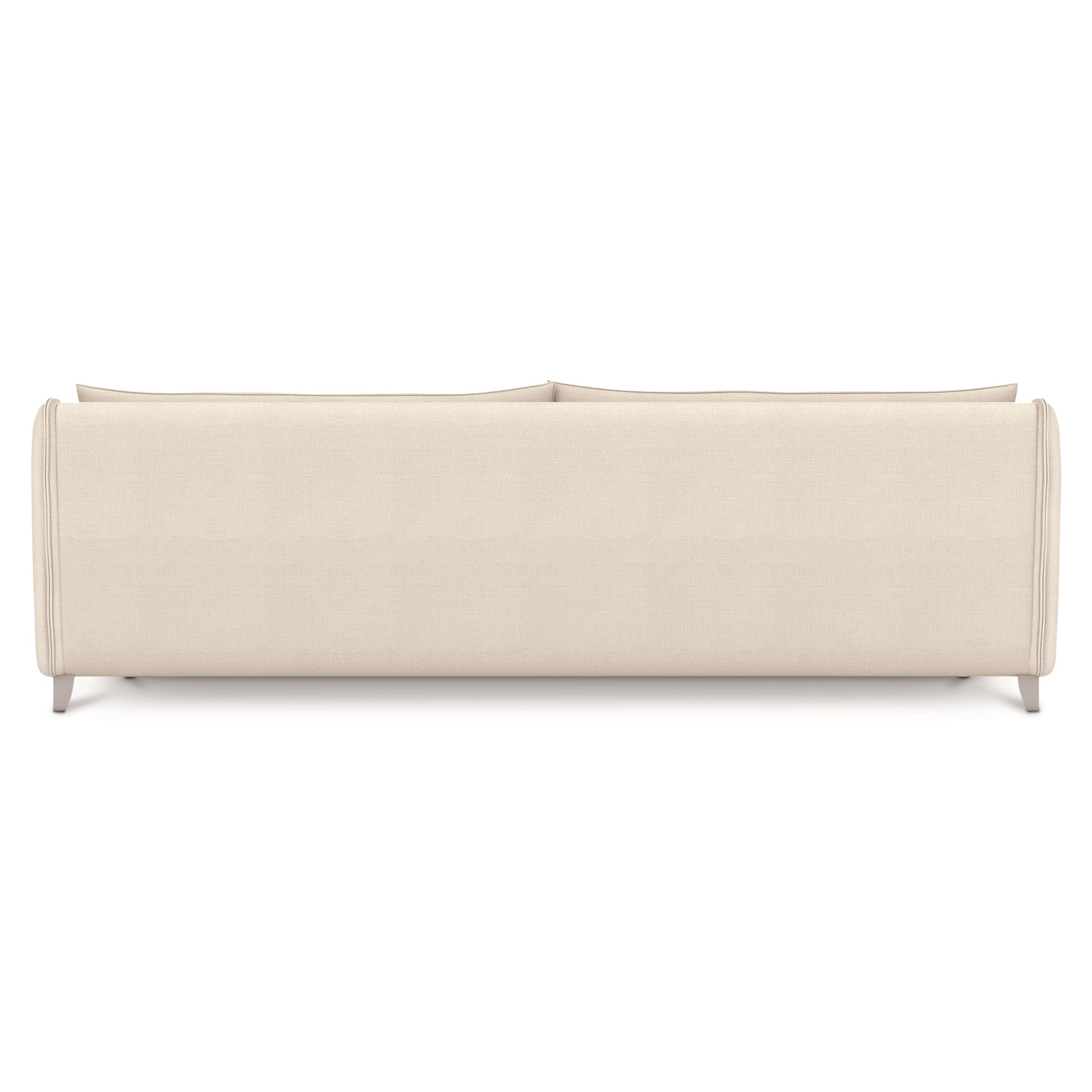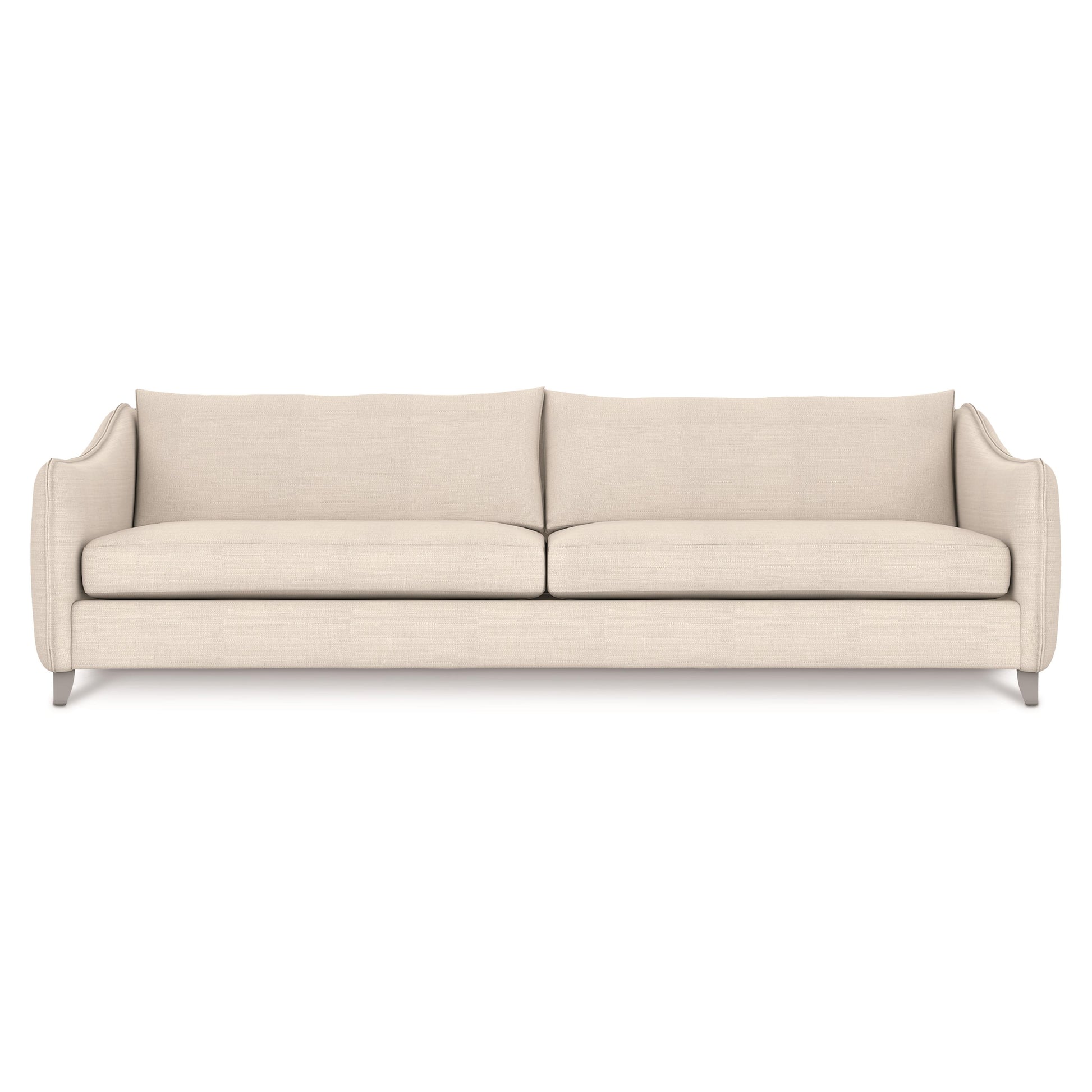 An elegant sofa featuring graceful curves, plush cushions and all-weather fabric to withstand the elements.