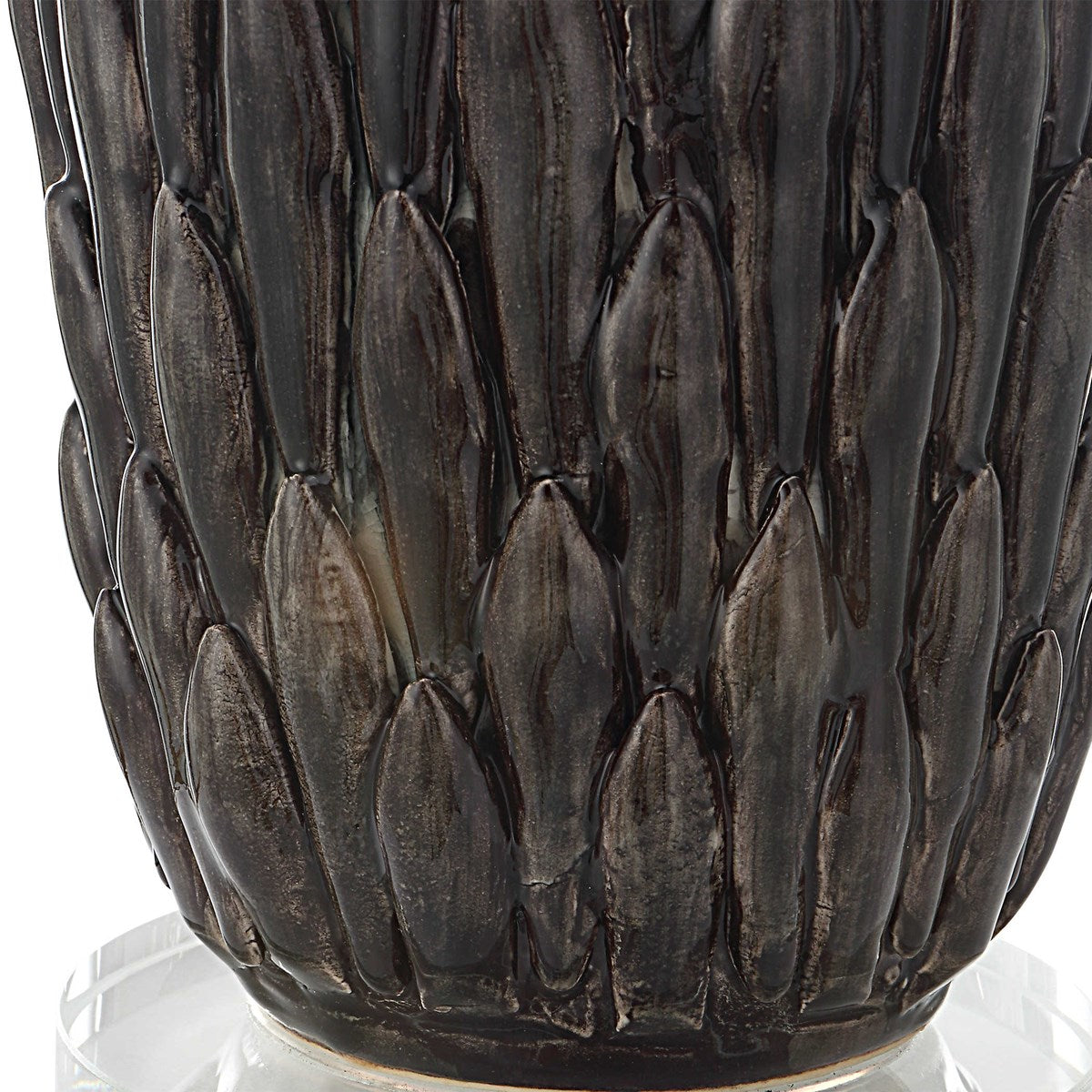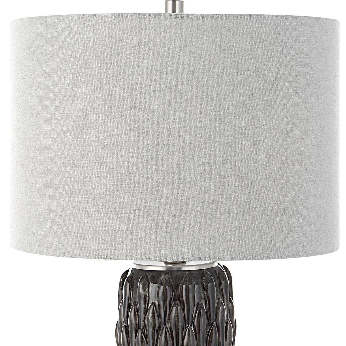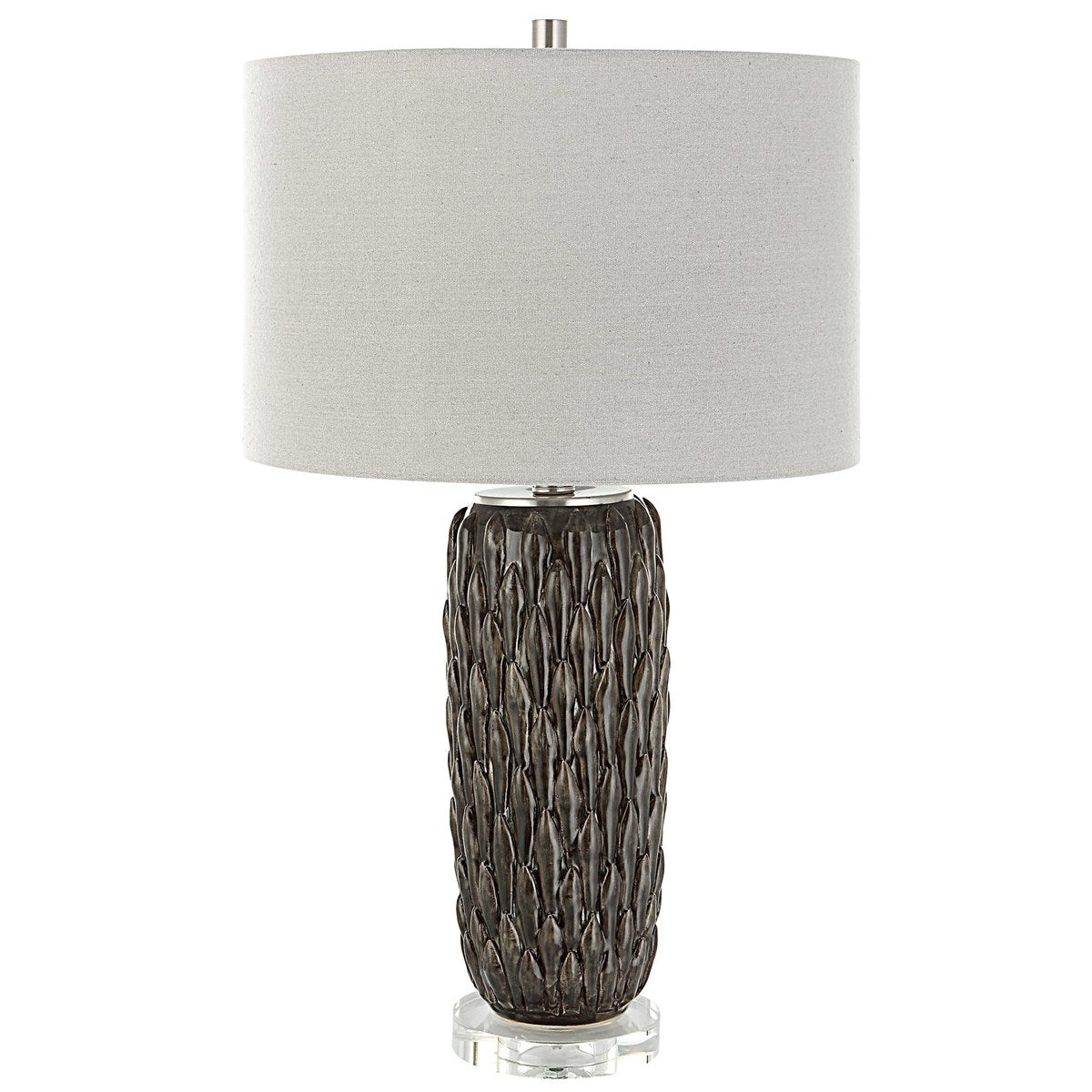 This ceramic table lamp features a deep mushroom gray glaze over carved details, accented with polished nickel plated details and an elegant crystal foot. The lamp is paired with a hardback drum shade in light gray.