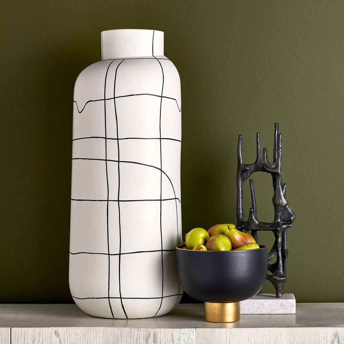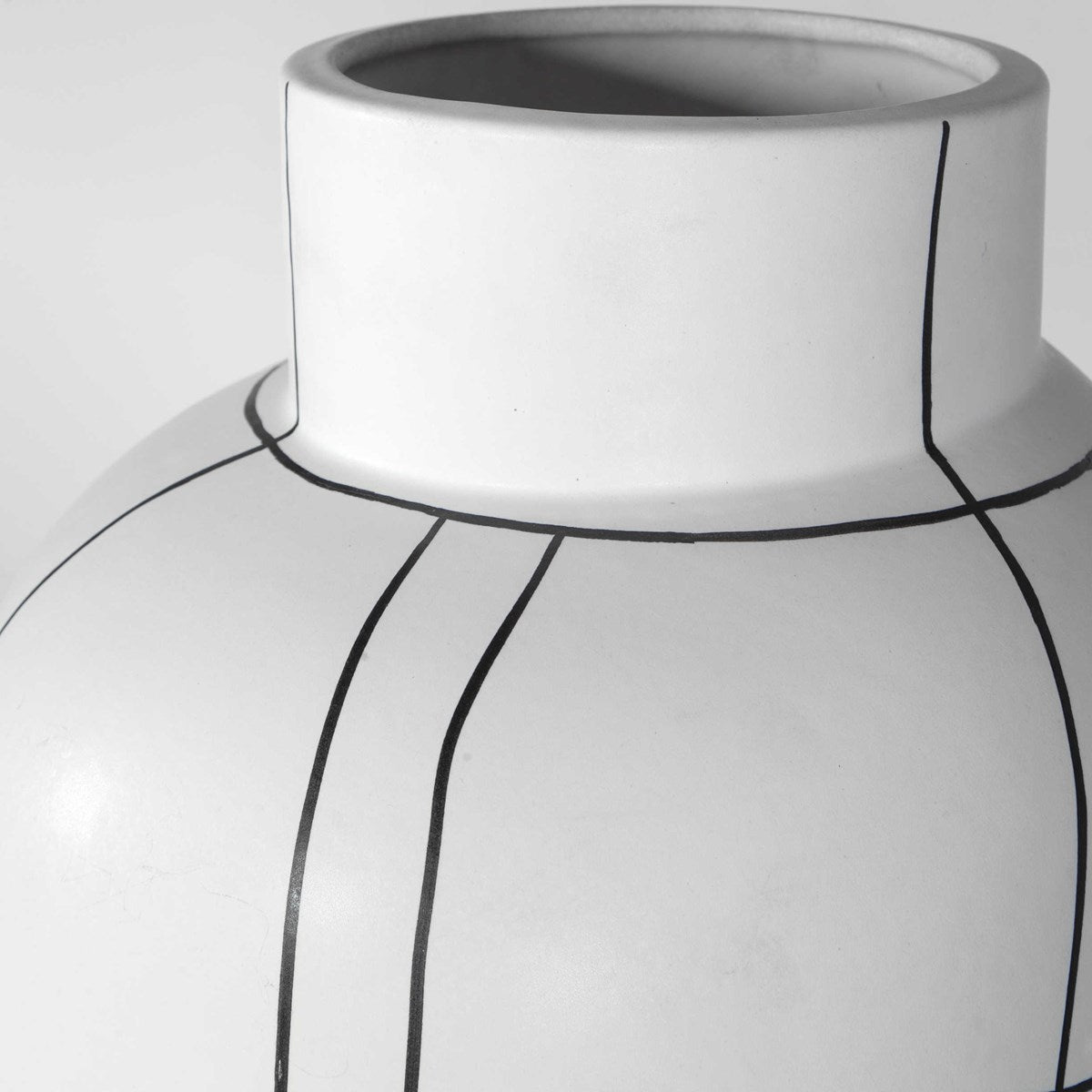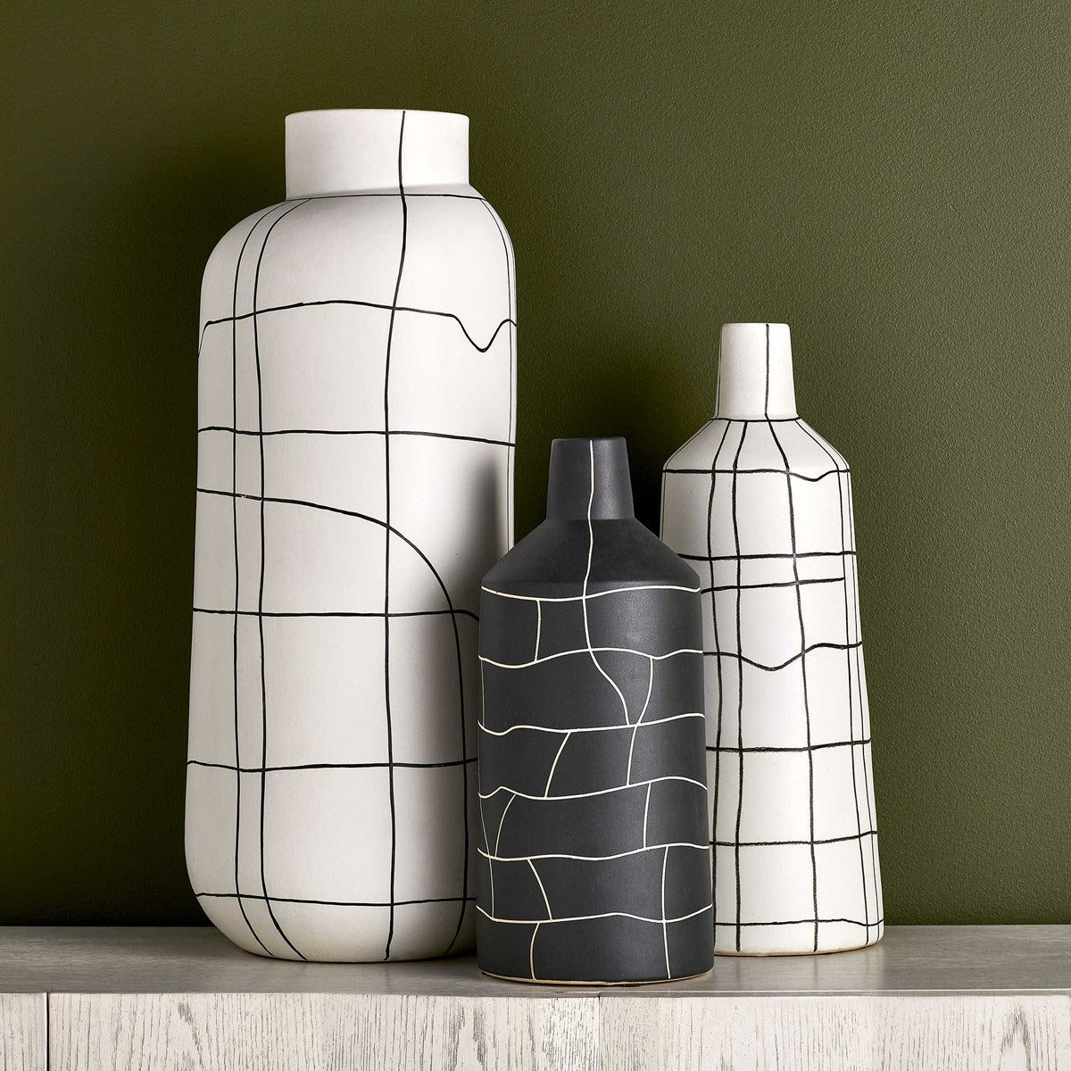 The ceramic Network Bottle is finished with a matte glaze decoration, and its black and white patterns are inspired by urban street maps. For decorative use only. Not safe for food or holding water.