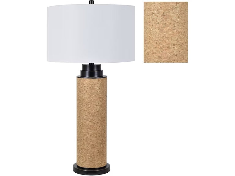 The Ollie Table Lamp by M Décore is a tower shaped cylinder lamp wrapped in natural cork mounted with matte black components. It has a clean modern sensibility.