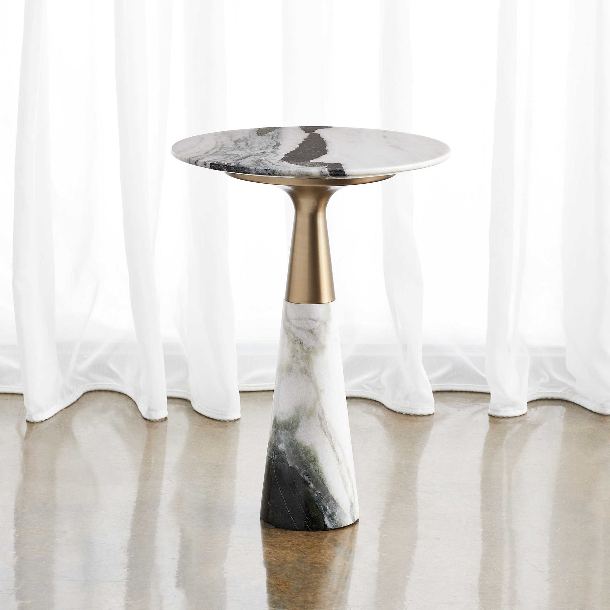 Made of dramatic and natural Panda marble with a polished finish, the organic modern shape features a rich brass finished sleeve. True to the nature of natural materials, each piece will have unique marbling and veining throughout, including shades of black, white and green.