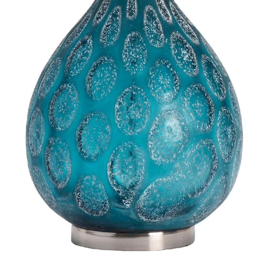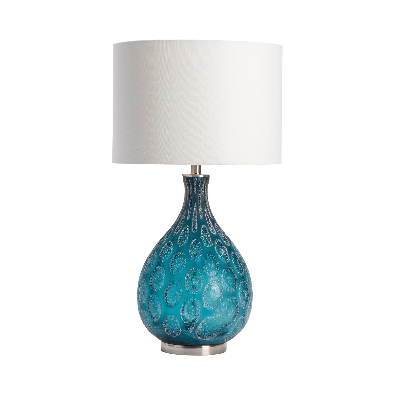 The Pearson Table Lamp has a colorful design that will liven up any room in your home. The bulb-shaped body has a striking blue color with a reactive glaze that resembles a geode. A bright white linen drum shade complements the bold jewel tone on the glass body. This transitional lamp makes the perfect accent piece in any decor style.