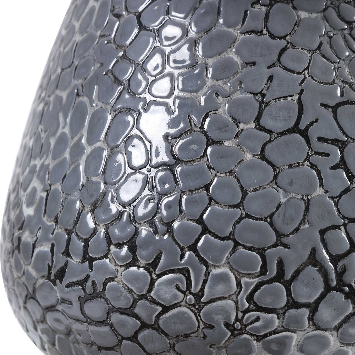 Reminiscent of natural river stones, this table lamp showcases an embossed textured ceramic base in a metallic charcoal gray finish with brushed nickel plated details. A light gray linen drum shade with natural slubbing accents the piece.