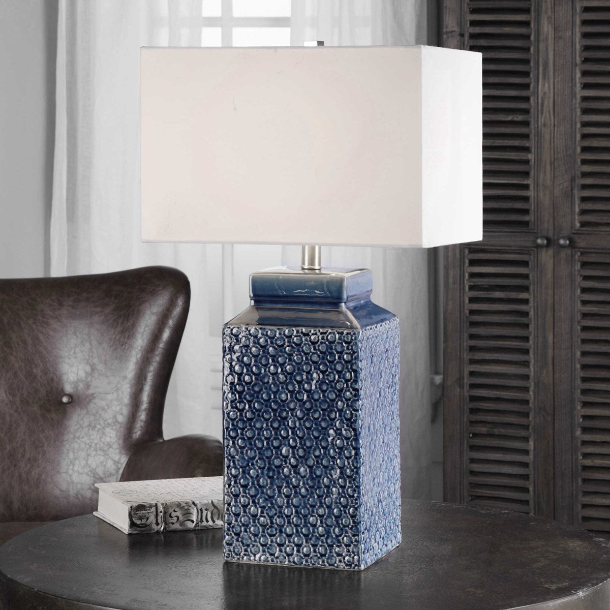 Textured ceramic finished in a fired Sapphire blue glaze accented with brushed nickel plated details. The rectangle hardback shade is a white linen fabric. Due to the nature of fired glazes on ceramic lamps, finishes will vary slightly.