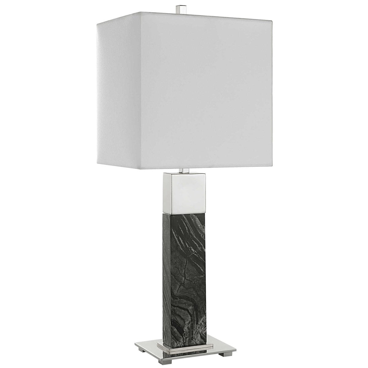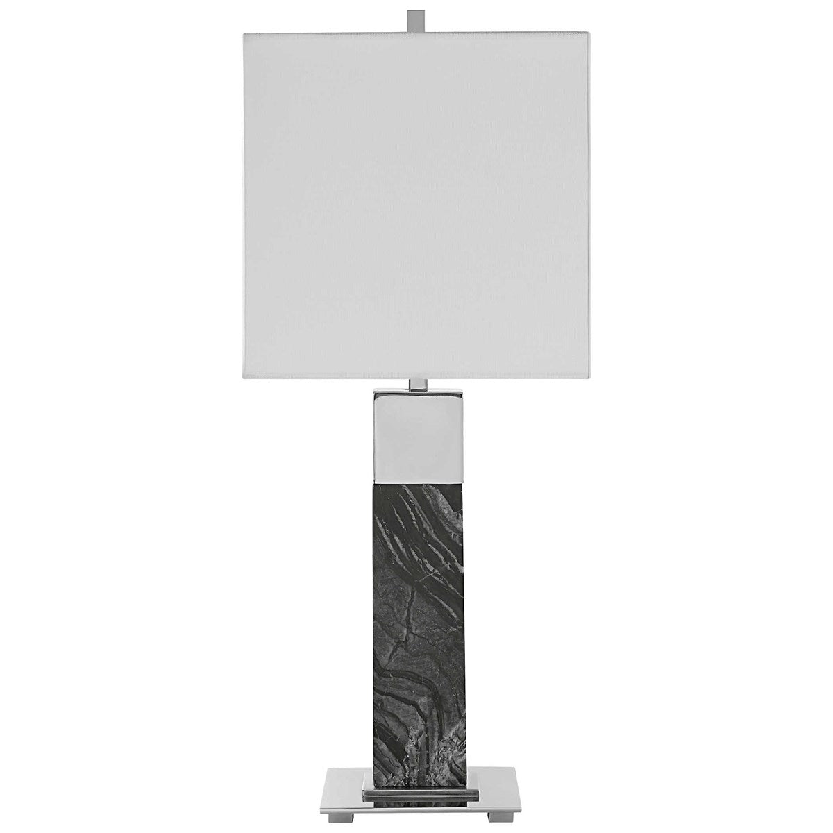 The perfect blend of classic and contemporary looks, this table lamp displays an elegant natural black marble column with gray and white veining accented by polished nickel plated finishes. The hardback square shade is covered in a crisp white linen fabric.