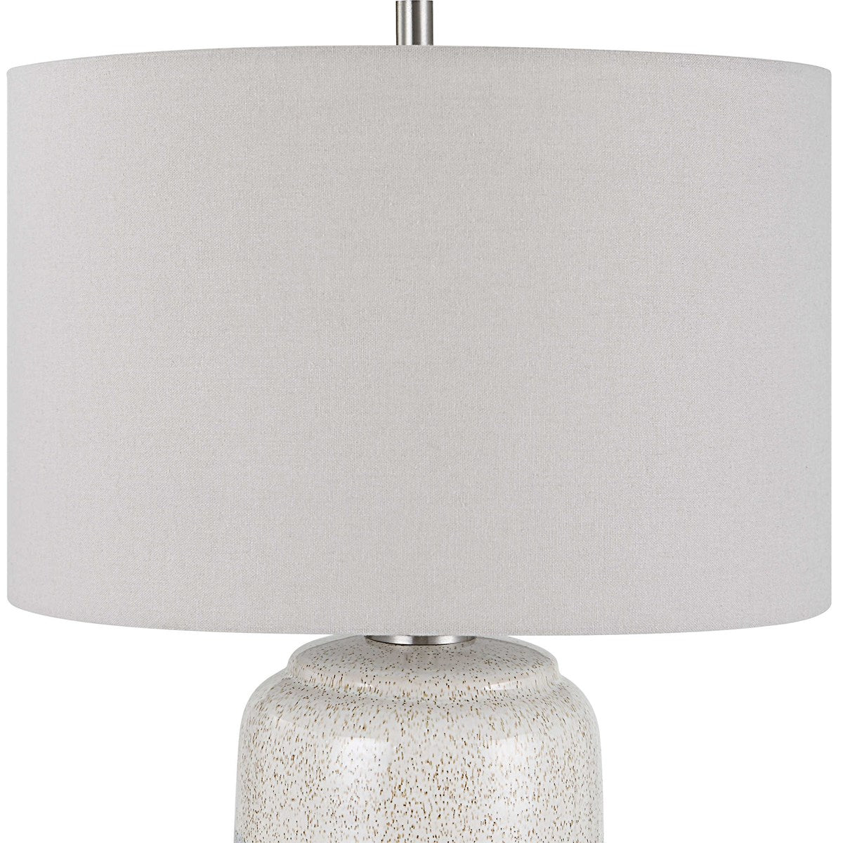 This ceramic table lamp features a heavy mottled white and gray bottom followed by a cool gray center stripe topped with a soft ivory cream accented with black specks and brushed nickel plated details. The hardback drum shade is covered in a light gray linen fabric.