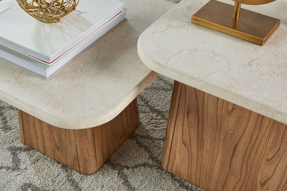Designed to look stylish when paired or apart, this duo is sure to be the centerpiece of any sitting area. Angular wooden columns support luxurious stone tops, a perfect blend of the natural world and contemporary style. The bunching tables can be combined with the Portico Accent Table to form a matching trio of varying sizes.