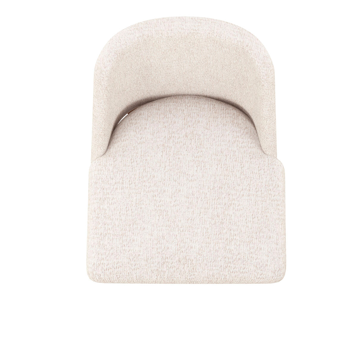 This side dining chair is inspired by the geometric forms of modern art and architecture. An exposed wood frame finished in warm sienna brown surrounds a gently curved backrest, fully upholstered in a creamy neutral woven fabric. Simple and sophisticated, this chair brings comfort and style to the table.