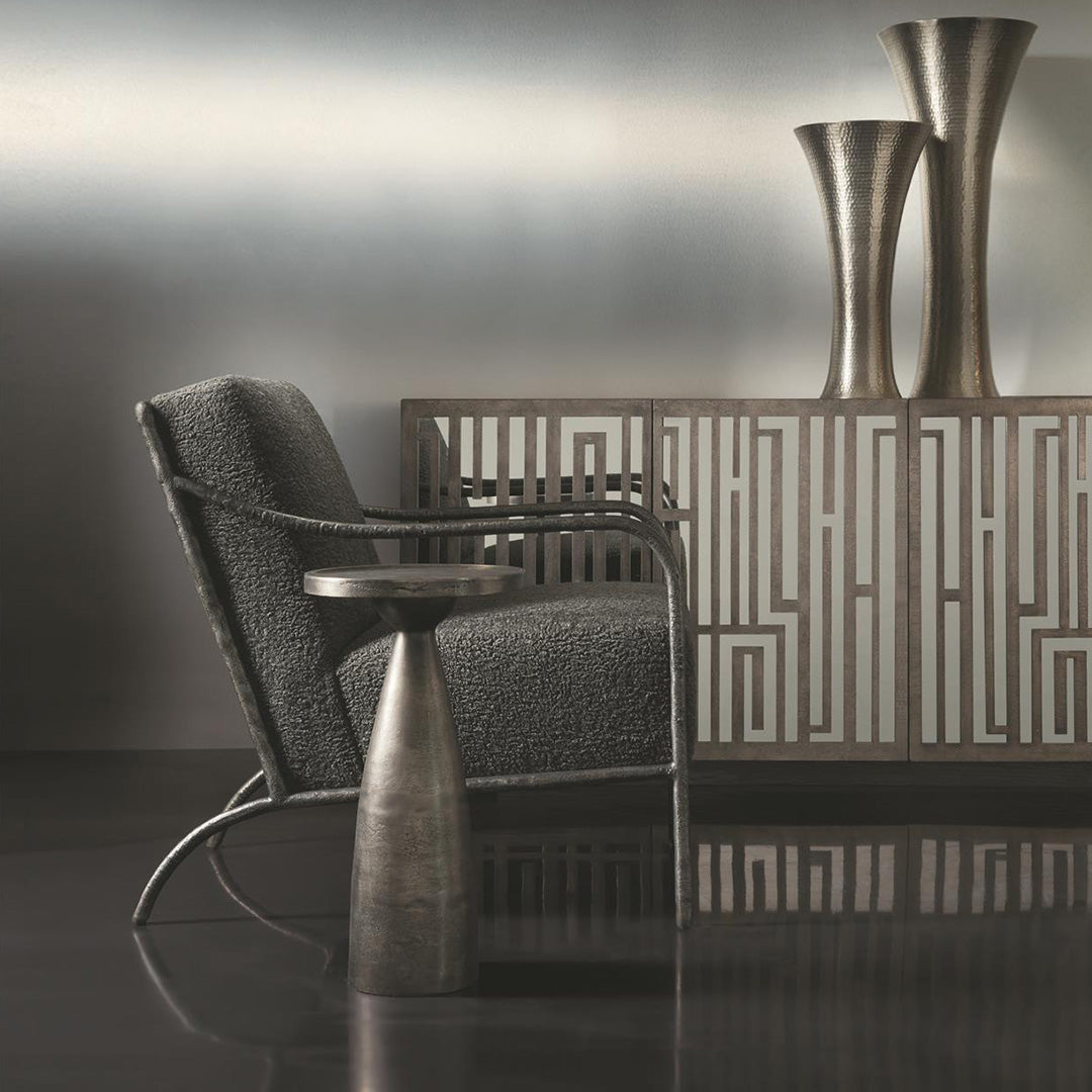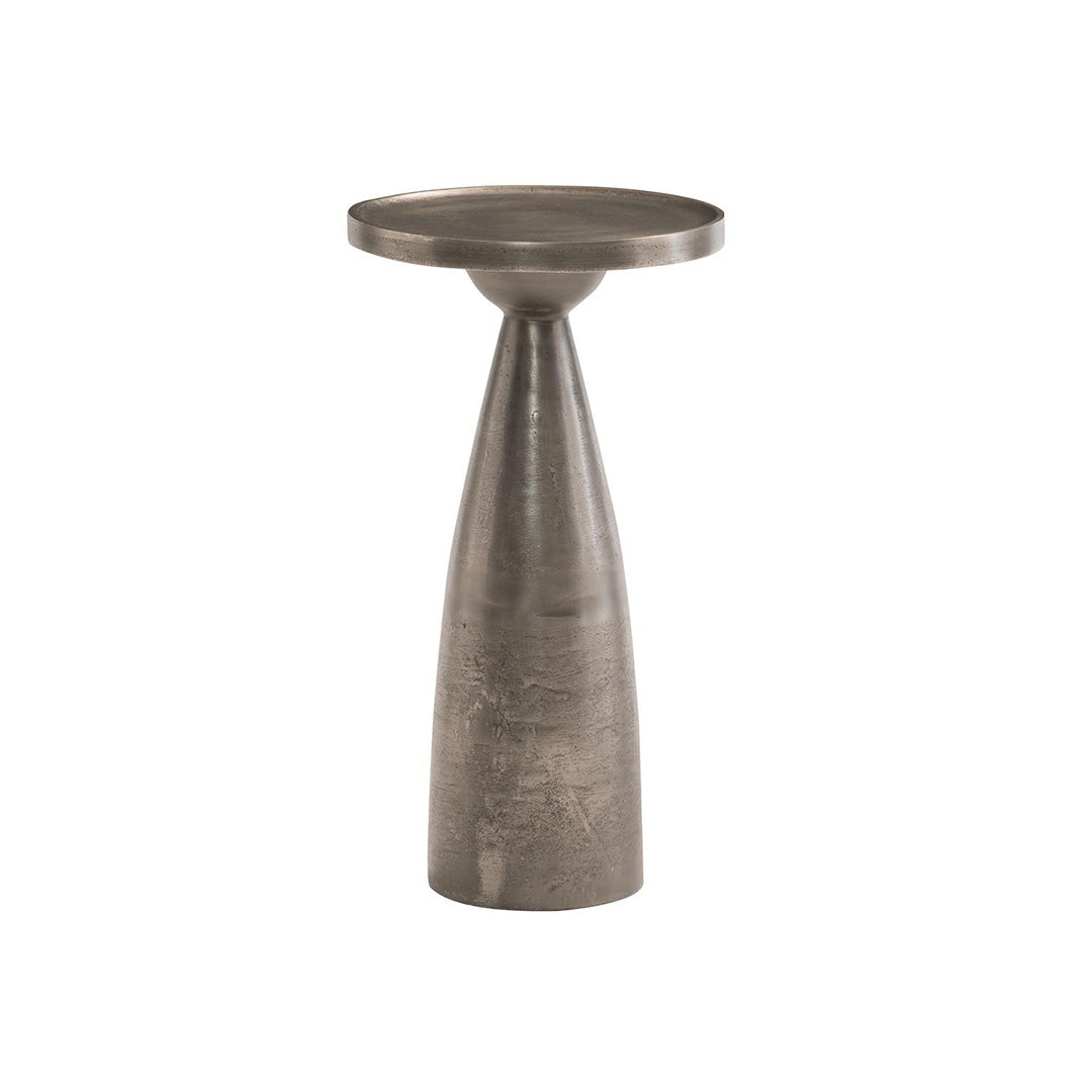 Functionality meets high design with the Radnor drink table. Sculptural in form, it features a round gallery top and a conical pedestal. Contributing to the unique character of this piece, a graphite finish on cast aluminum adds texture and industrial appeal.