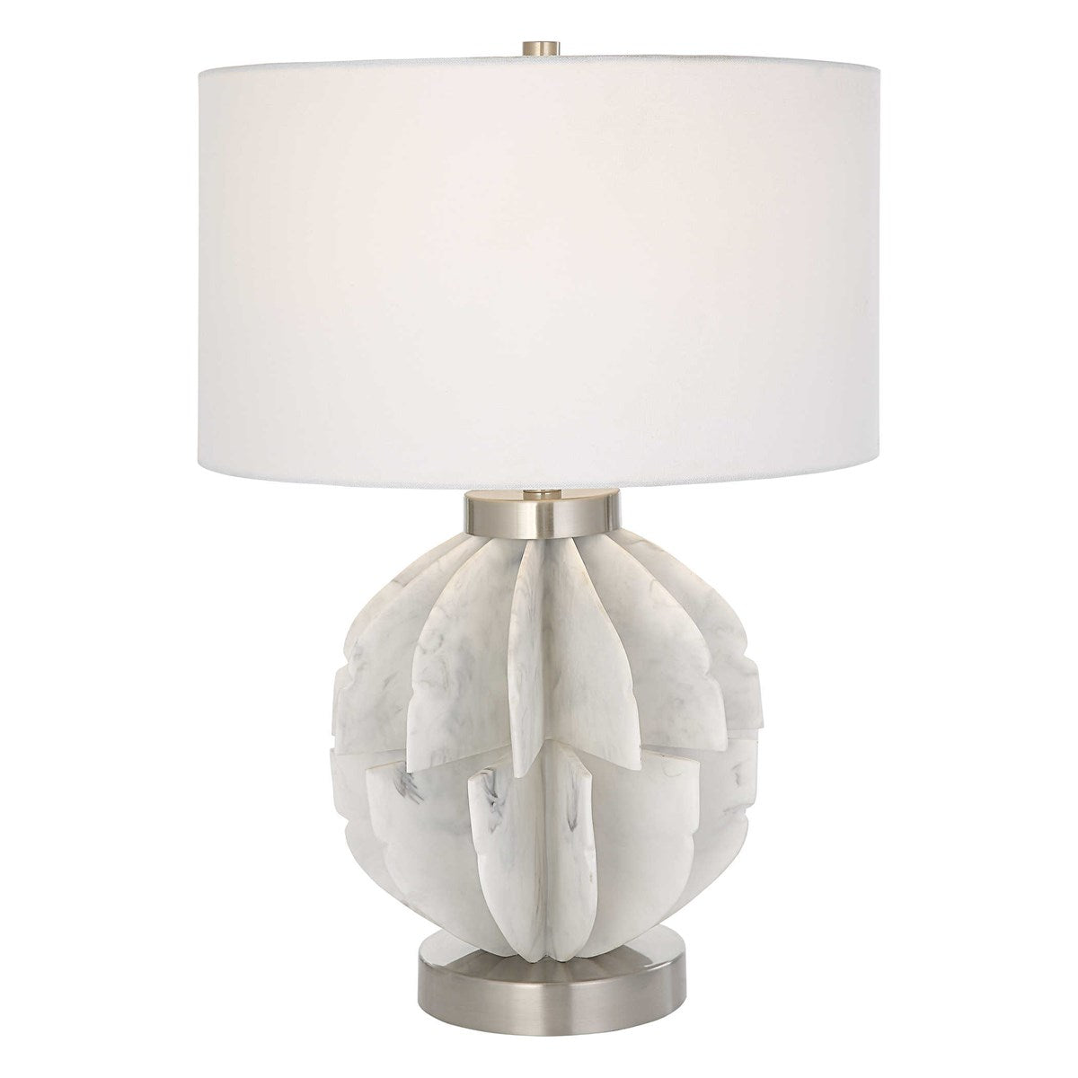 This contemporary table lamp features thin stacked blades that create an organic sphere finished in a white marble look accented by plated brushed nickel accents. The lamp is paired with a white fabric drum shade.