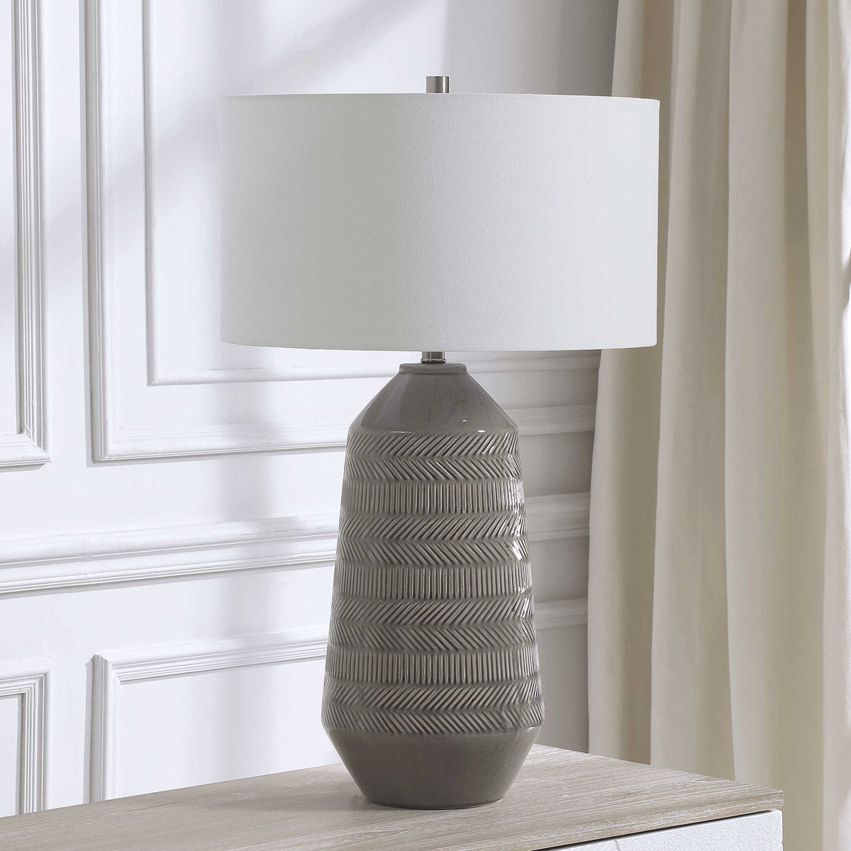 Showcasing a classic carved herringbone pattern, this ceramic table lamp is finished in a versatile soft gray glaze with brushed nickel accents. A white fabric drum shade completes the look.