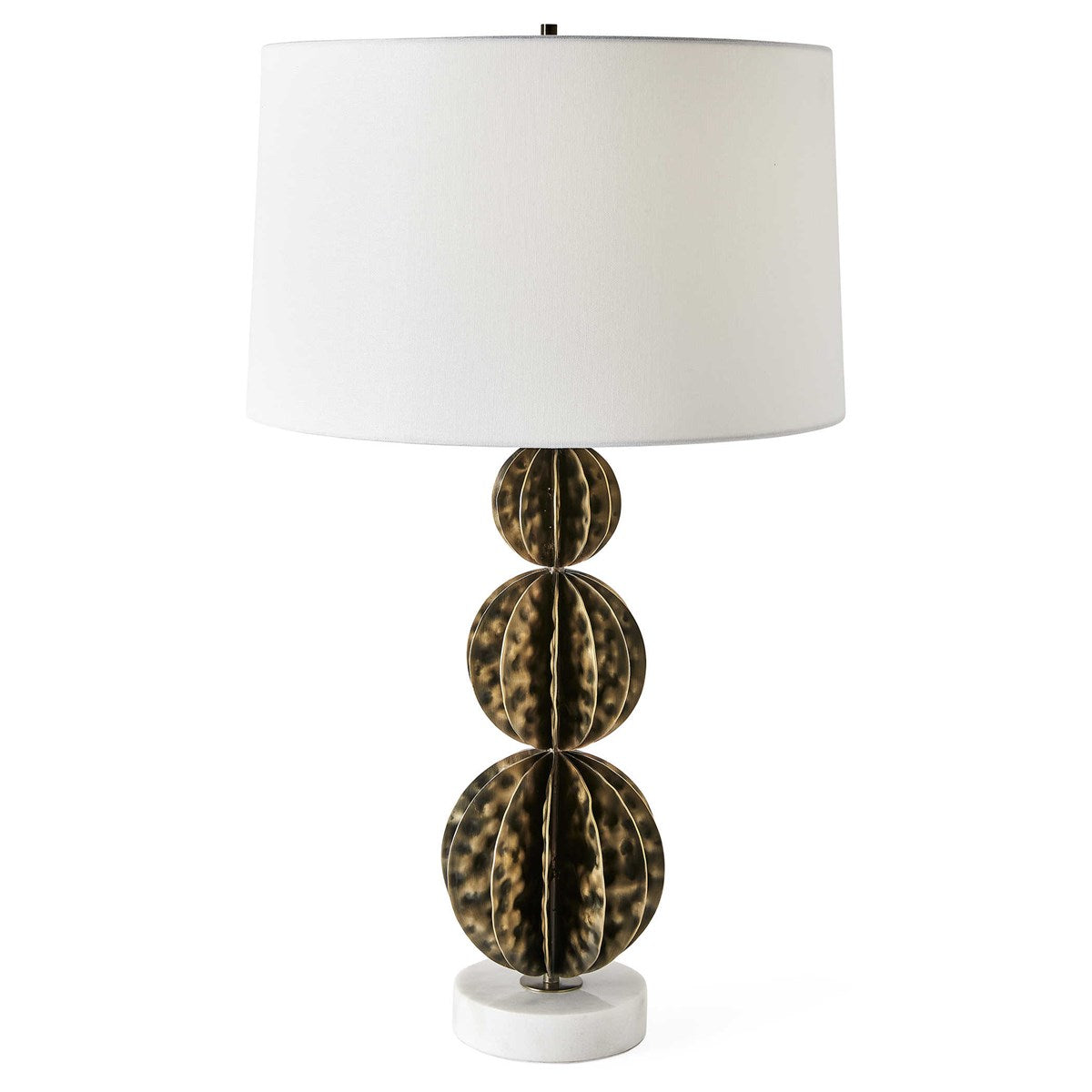 Three ascending Roundelay Sculptures create depth and dimension with their hammered iron pages. Resting on a white marble base, finished with a round tapered hardback shade and a cylindrical finial.
