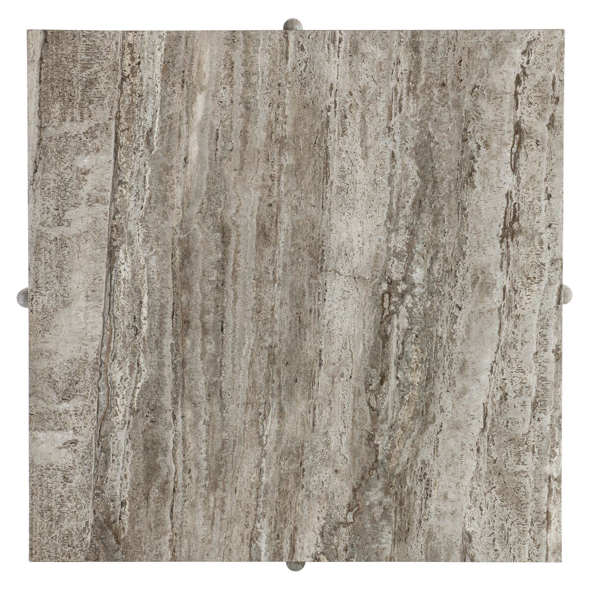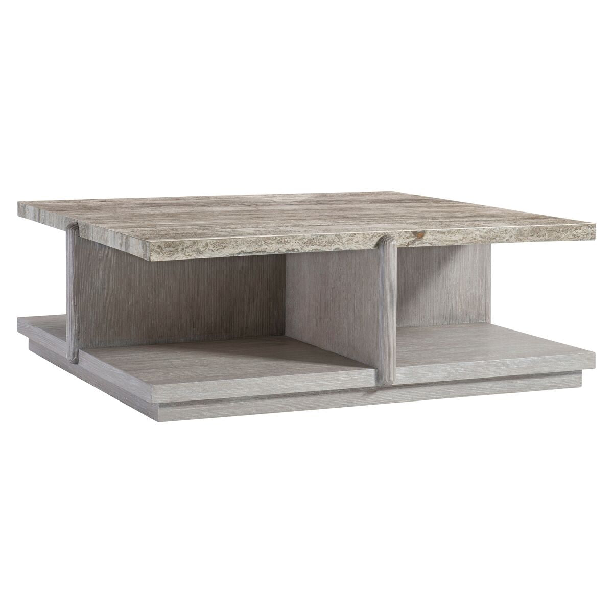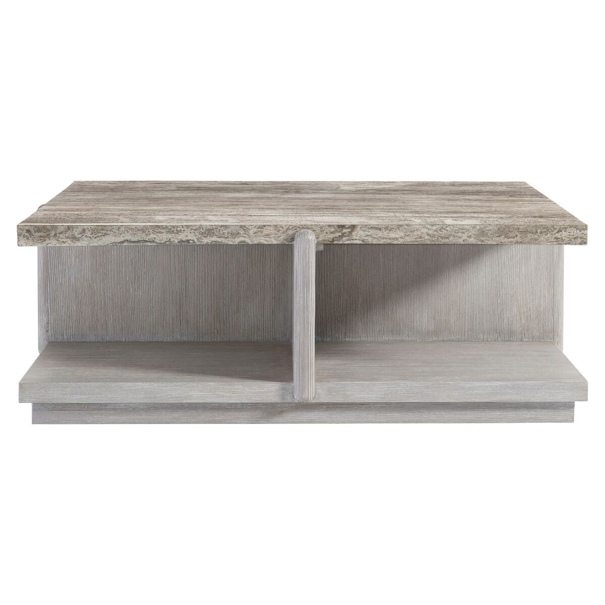 The Sereno cocktail table has a partitioned wood base that offers open storage in a textured Grigio finish. The center panels rise up to support and intersect with the silver travertine stone top. The result is a fresh perspective on modern rustic design.