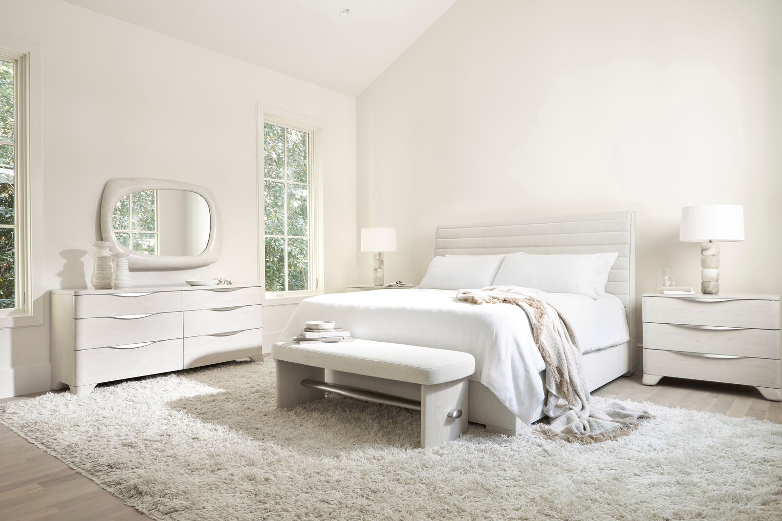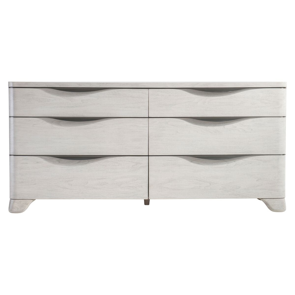 Simple lines are redefined with a modern style in the Sereno dresser. Six soft-close drawers offer full length brushed stainless steel pulls that curve with a sinuous style that adds dimension. Cast resin feet have a faux stone texture, with the dresser finished in Lutra.