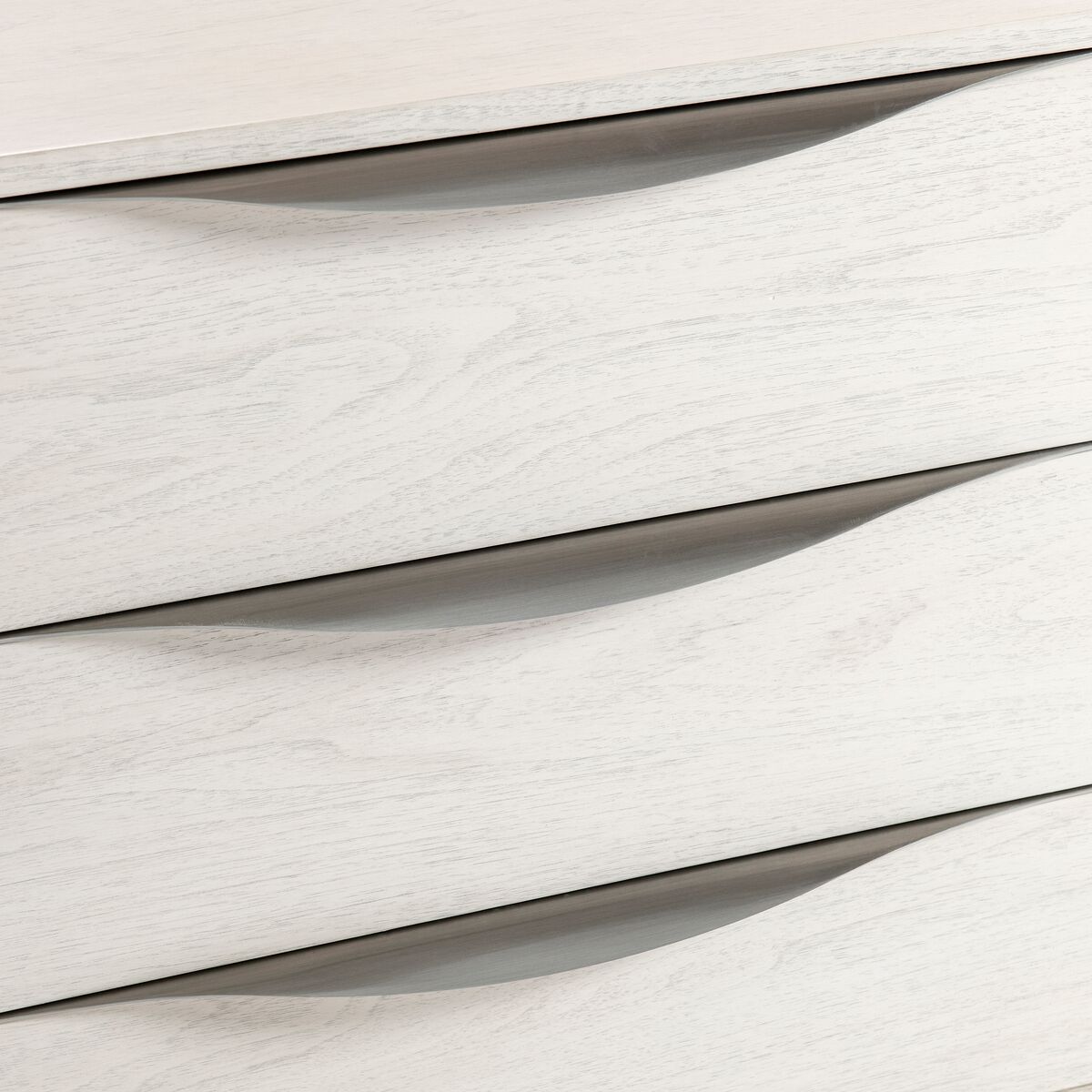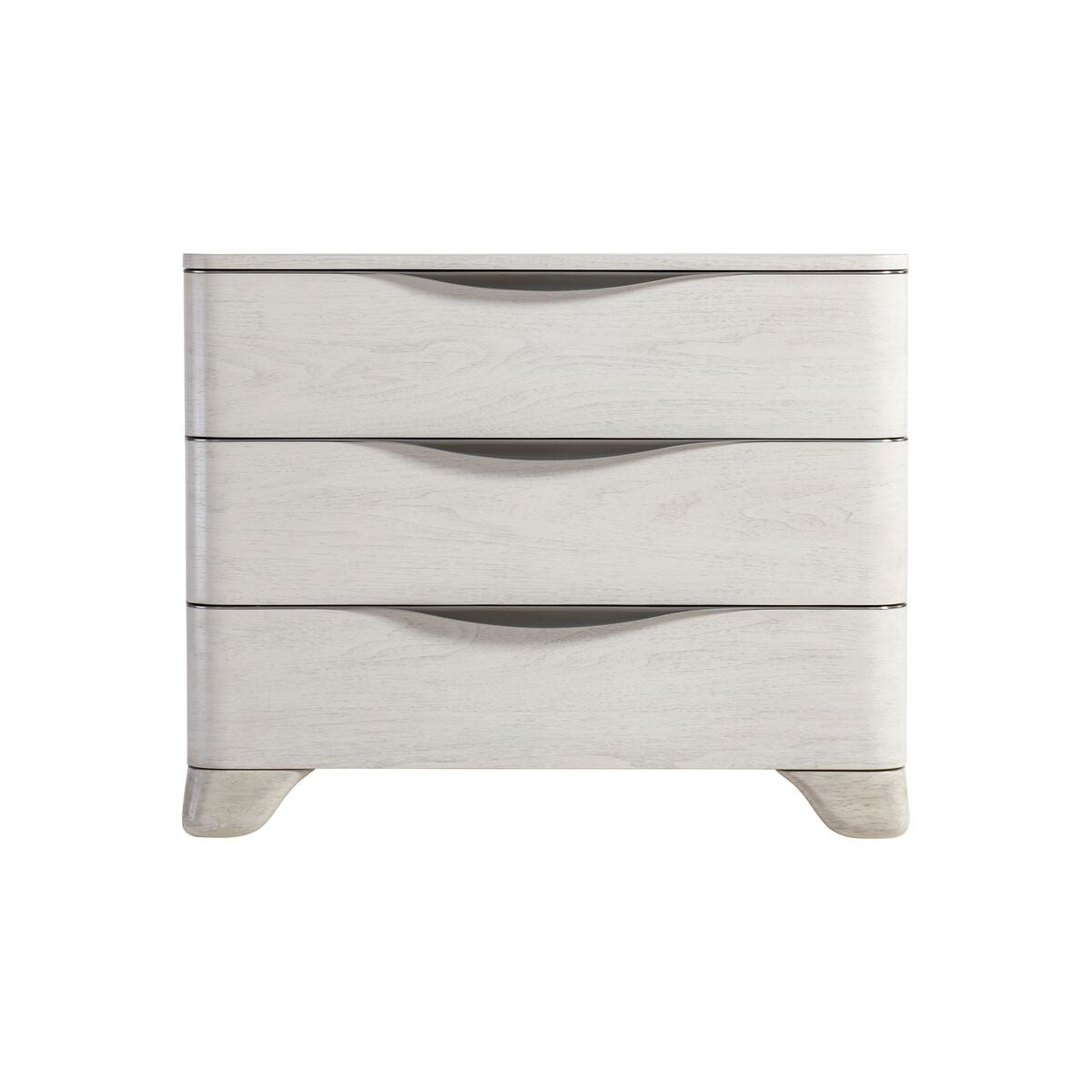 Simple lines are redefined with a modern style in the Sereno nightstand. Three soft-close drawers offer full length brushed stainless steel pulls that curve with a sinuous style that adds dimension. Modern technology is offered with a two-port USB charging unit.