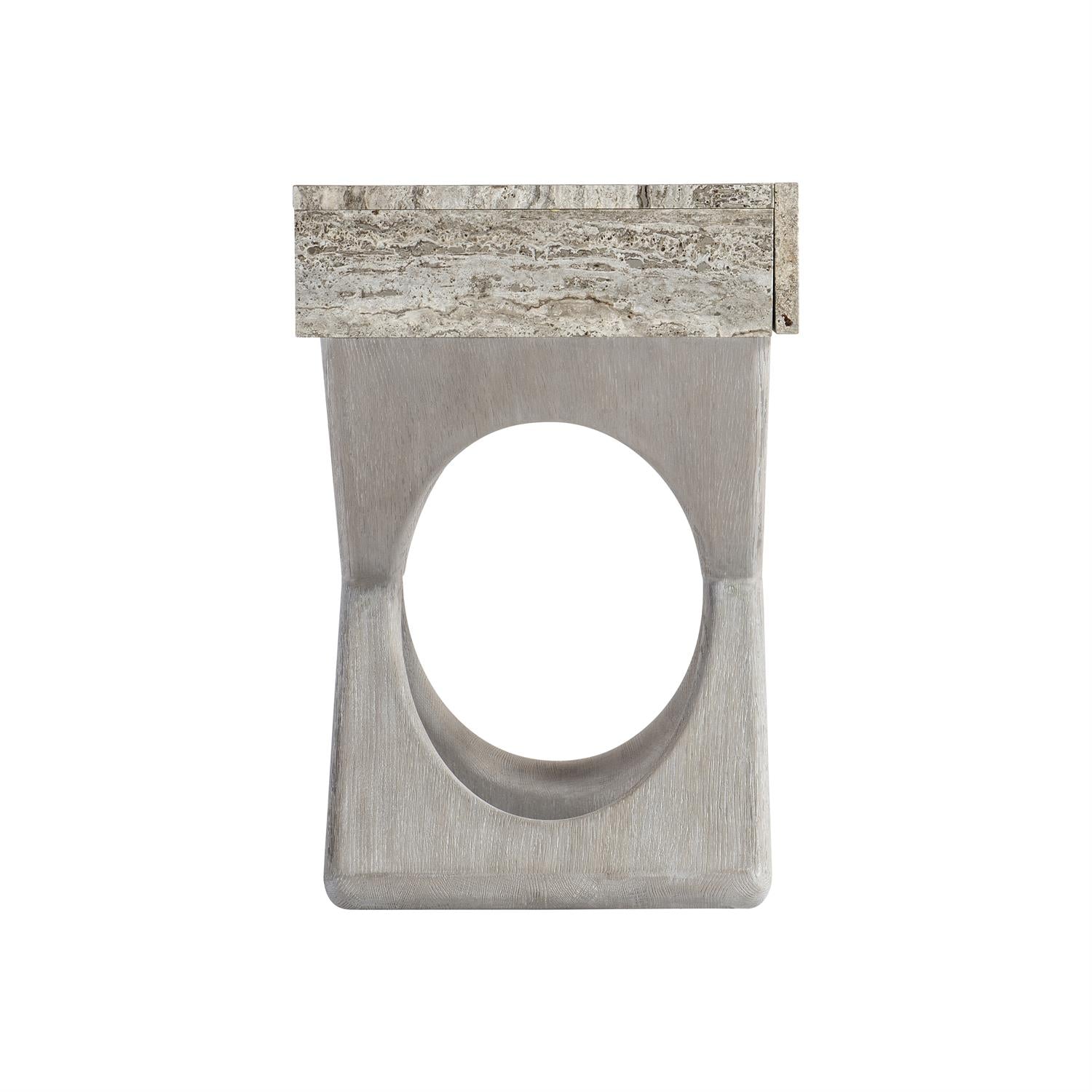 The X-shaped base on the Sereno nightstand offers a sophisticated aesthetic with two intersecting panels with an open organic shape. The base supports a stunning silver travertine drawer box that features an outlet on the back with a USB port.