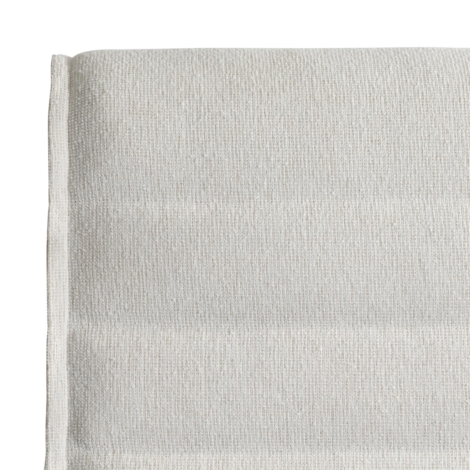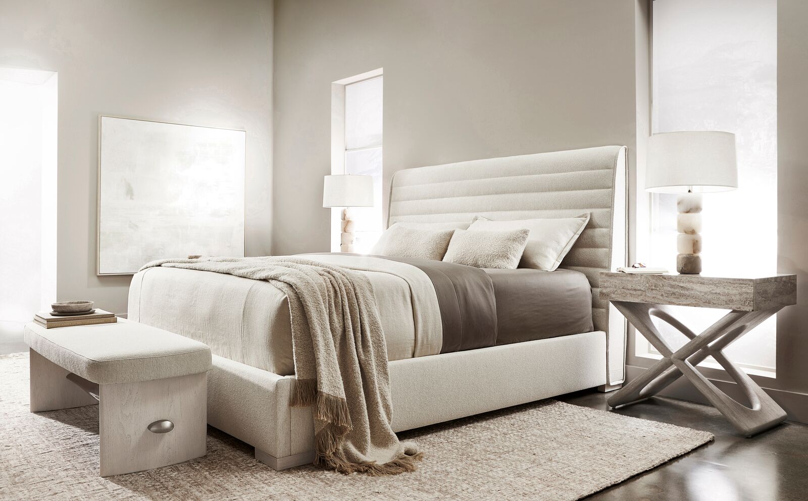 The Sereno panel bed is clean and organic with softened edges and a simplified form. The frame is fully upholstered with horizontal channels for chic comfort. The side panels on the headboard offer unique shaping with flanged edges.