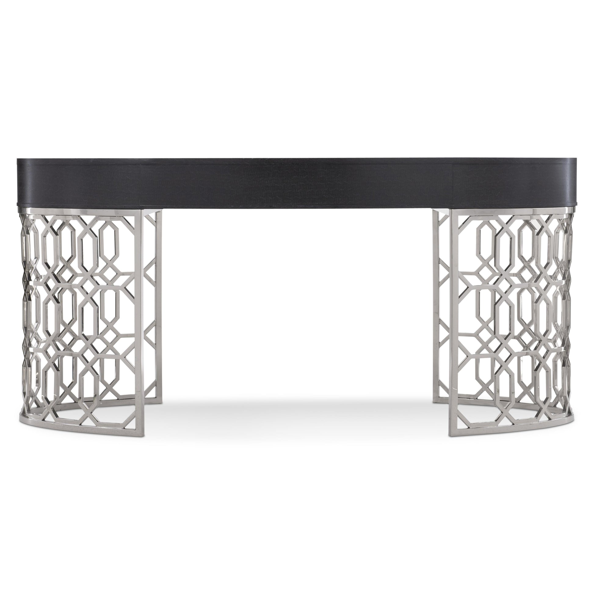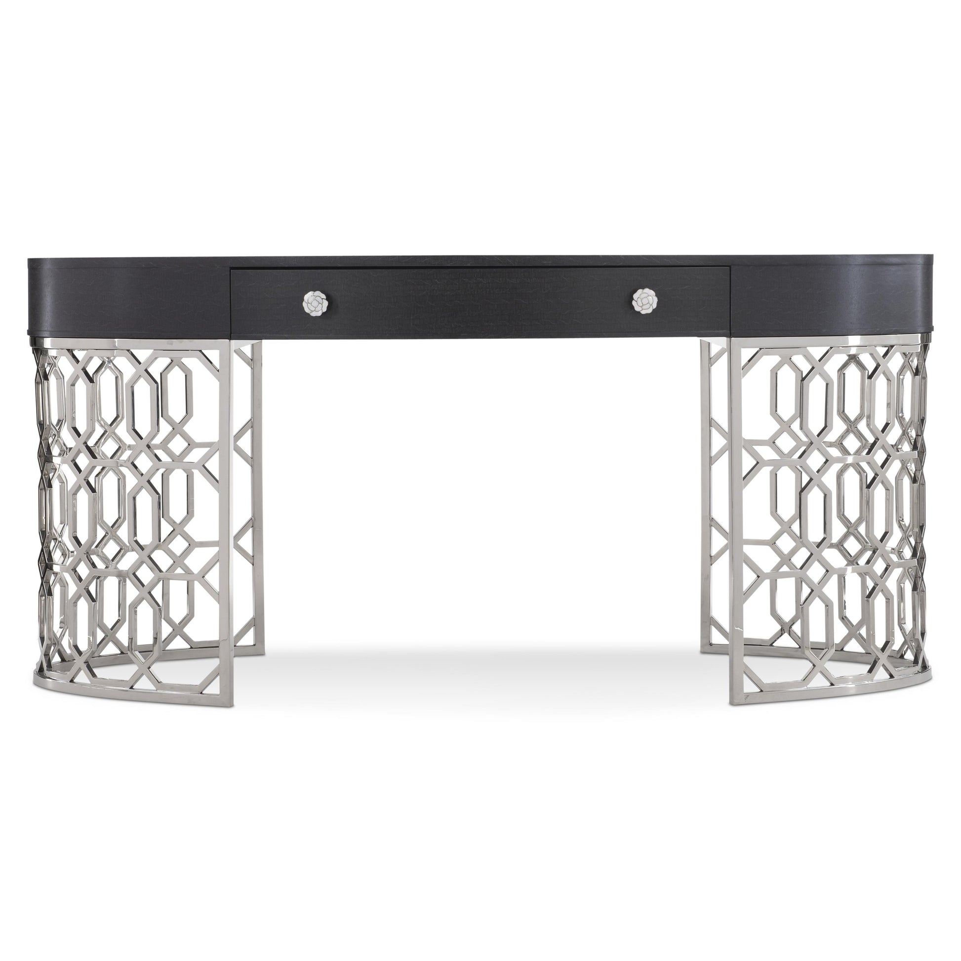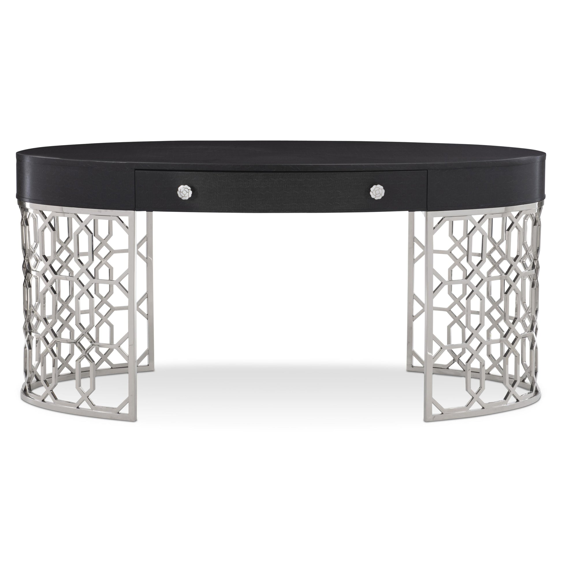 Silhouette is defined by bold contrasts, subtle curves and a hint of Hollywood Regency allure. The glamorous Silhouette desk exudes opulence with dazzling materials and feminine accents. A Figured Onyx finish on the fancy face oval top offers an intriguing texture. The single drawer features elegant floral pulls with inlaid kabebe shells. Crafted from polished stainless steel, two semi-circular columns feature a striking geometric pattern.