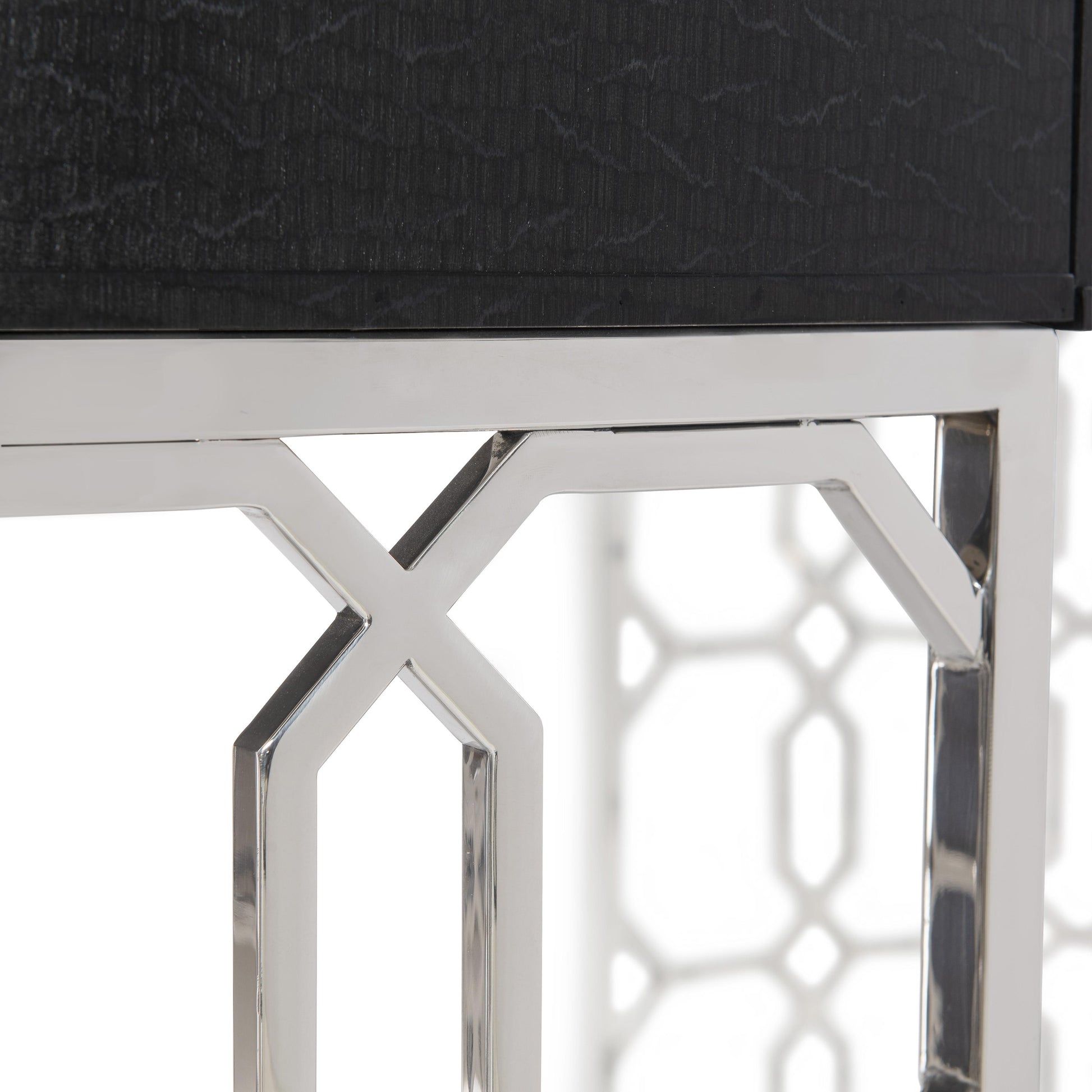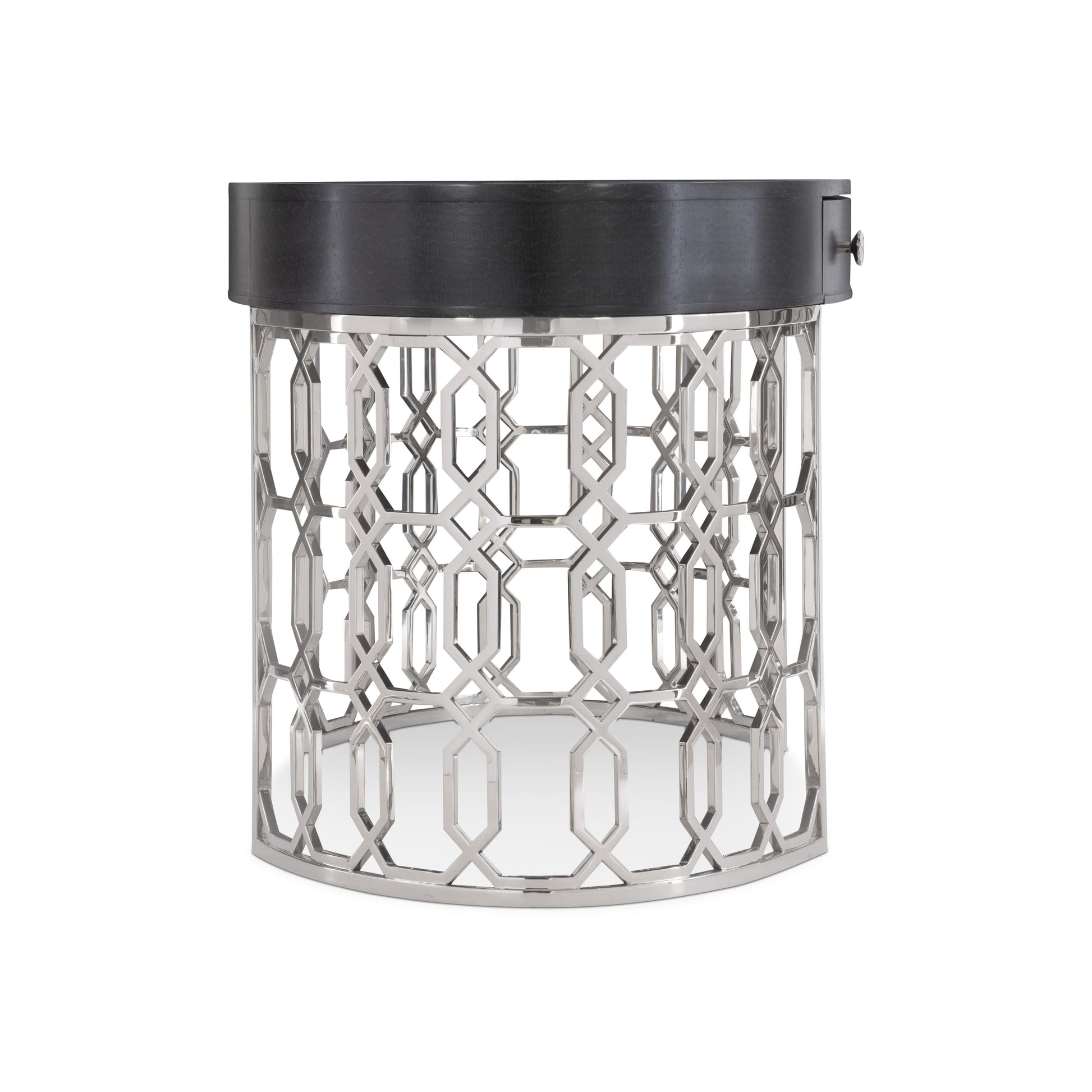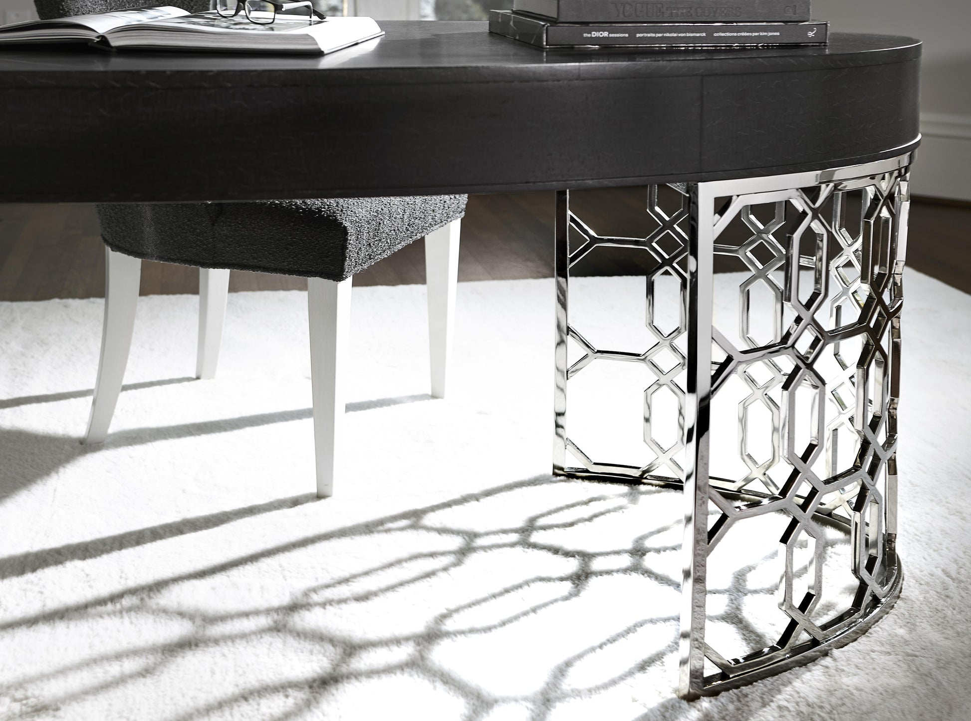 Silhouette is defined by bold contrasts, subtle curves and a hint of Hollywood Regency allure. The glamorous Silhouette desk exudes opulence with dazzling materials and feminine accents. A Figured Onyx finish on the fancy face oval top offers an intriguing texture. The single drawer features elegant floral pulls with inlaid kabebe shells. Crafted from polished stainless steel, two semi-circular columns feature a striking geometric pattern.