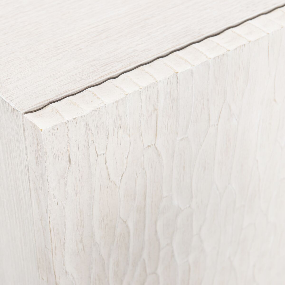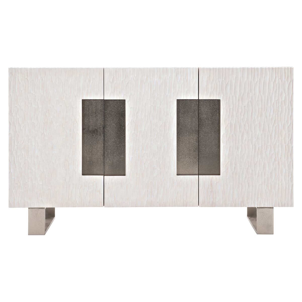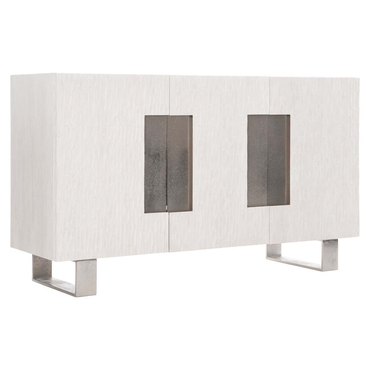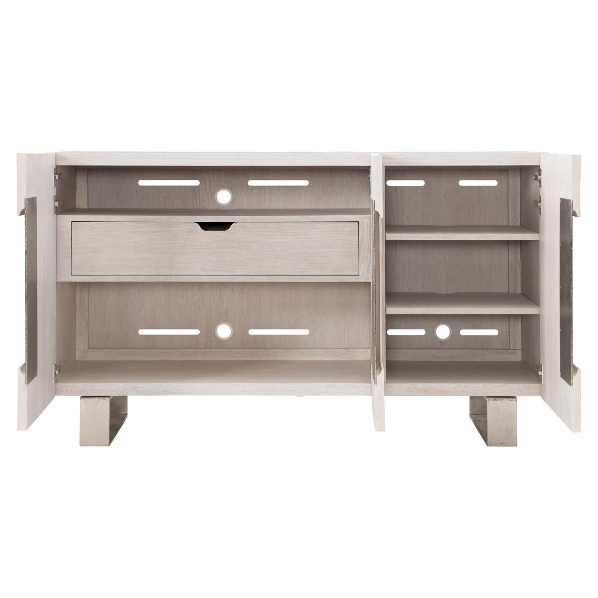 A harmony of simplicity and modernity, texture and neutrals, the Solaria buffet makes the most of form and function. Chiseled resin door fronts in a Weathered Bone finish are the perfect contrast to cast aluminum door panels and legs. The doors open to reveal impeccable storage with shelves and a drawer. The buffet can be used for china and tableware storage or as a media unit.