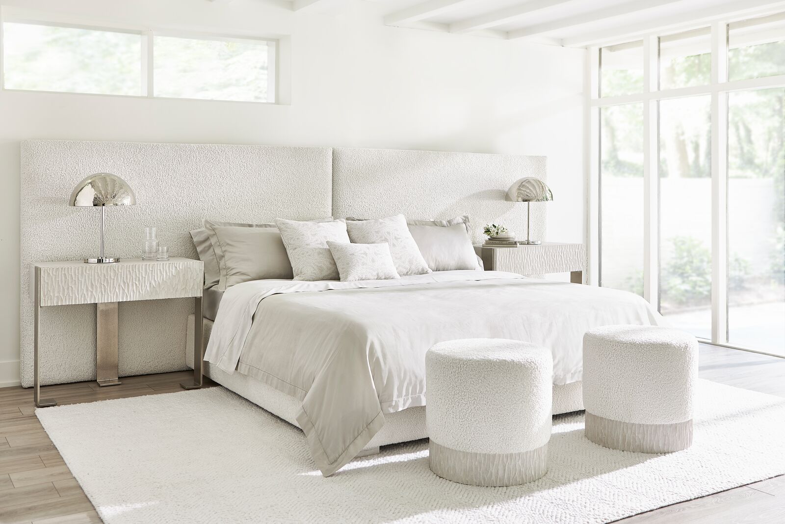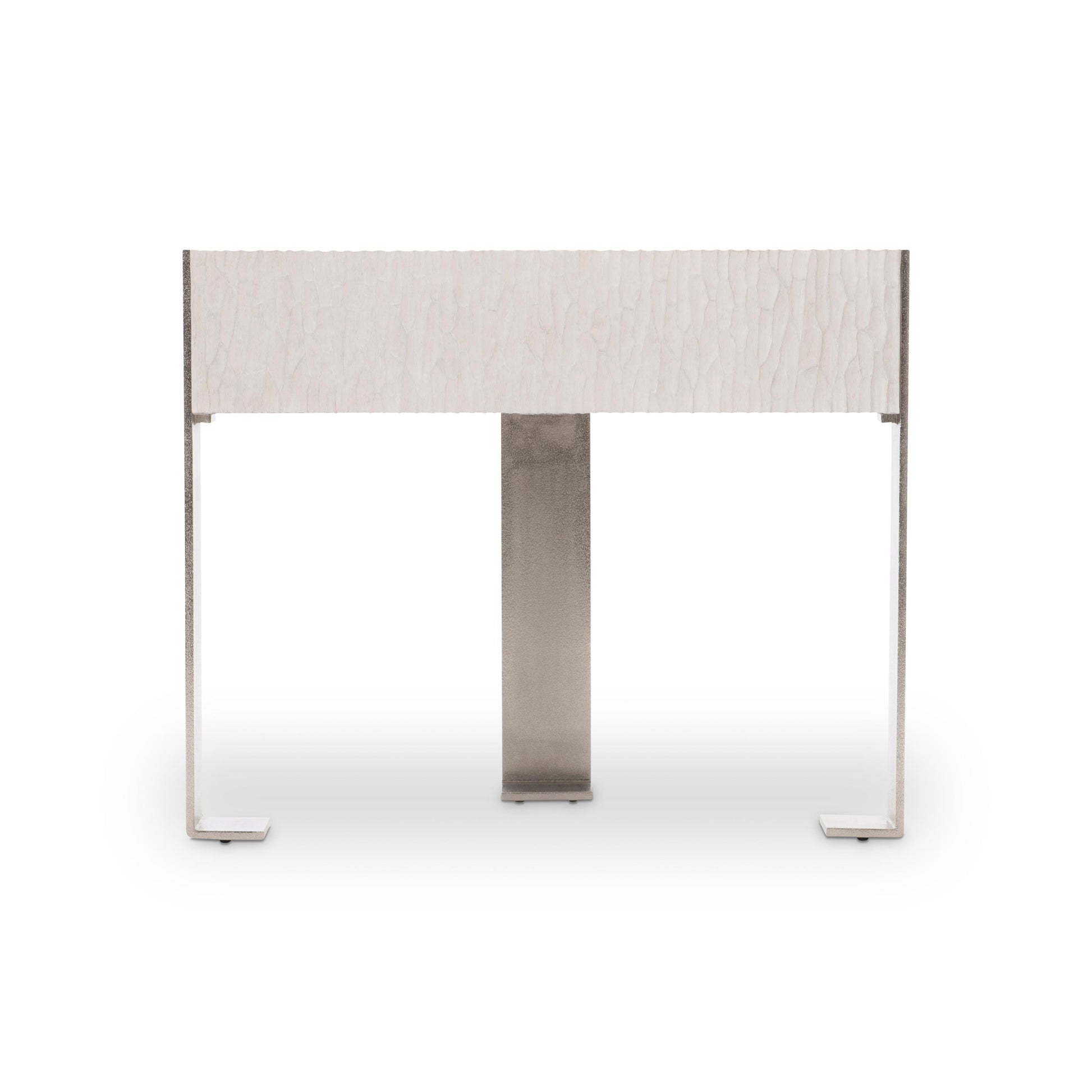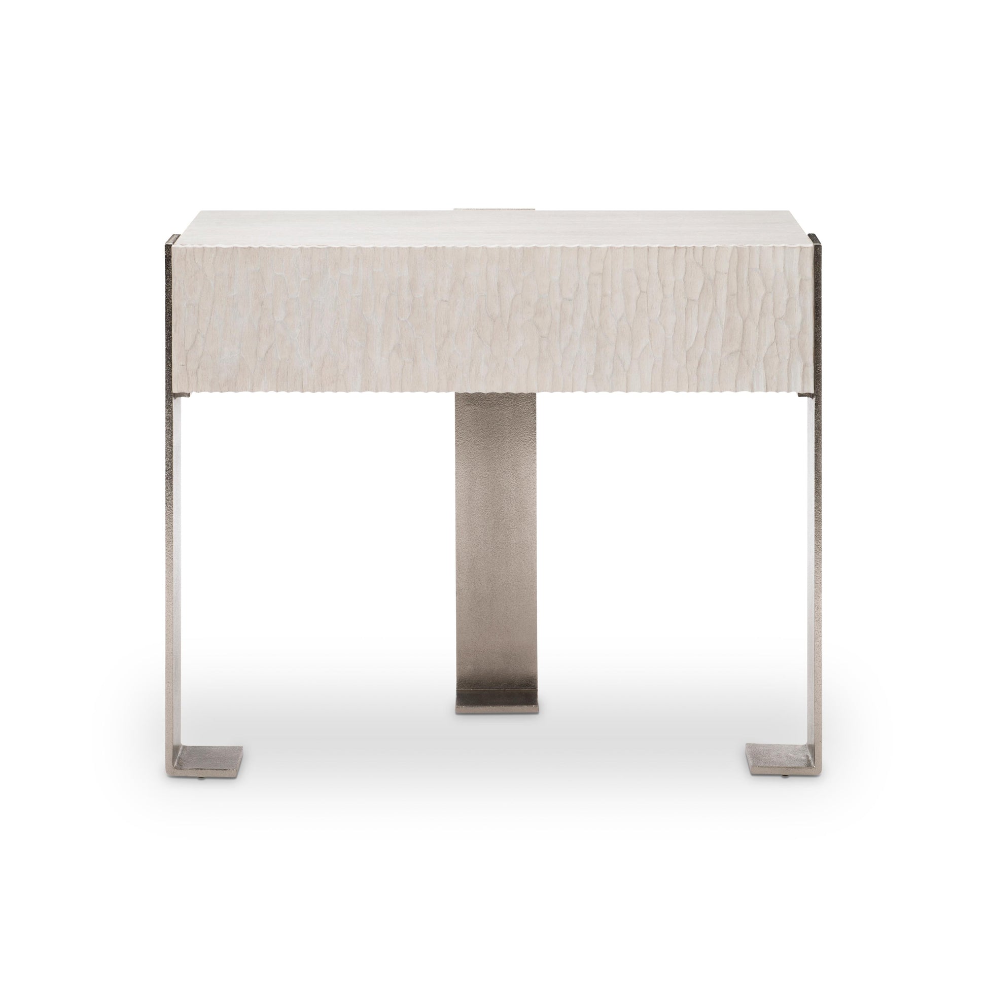 Three cast aluminum supports create a structural tripod, curving to the floor to define the legs of the Solaria nightstand. They encompass a drawer box with a chiseled cast resin front and a Weathered bone finish. A two-port USB charger is located on the upper back of the case.