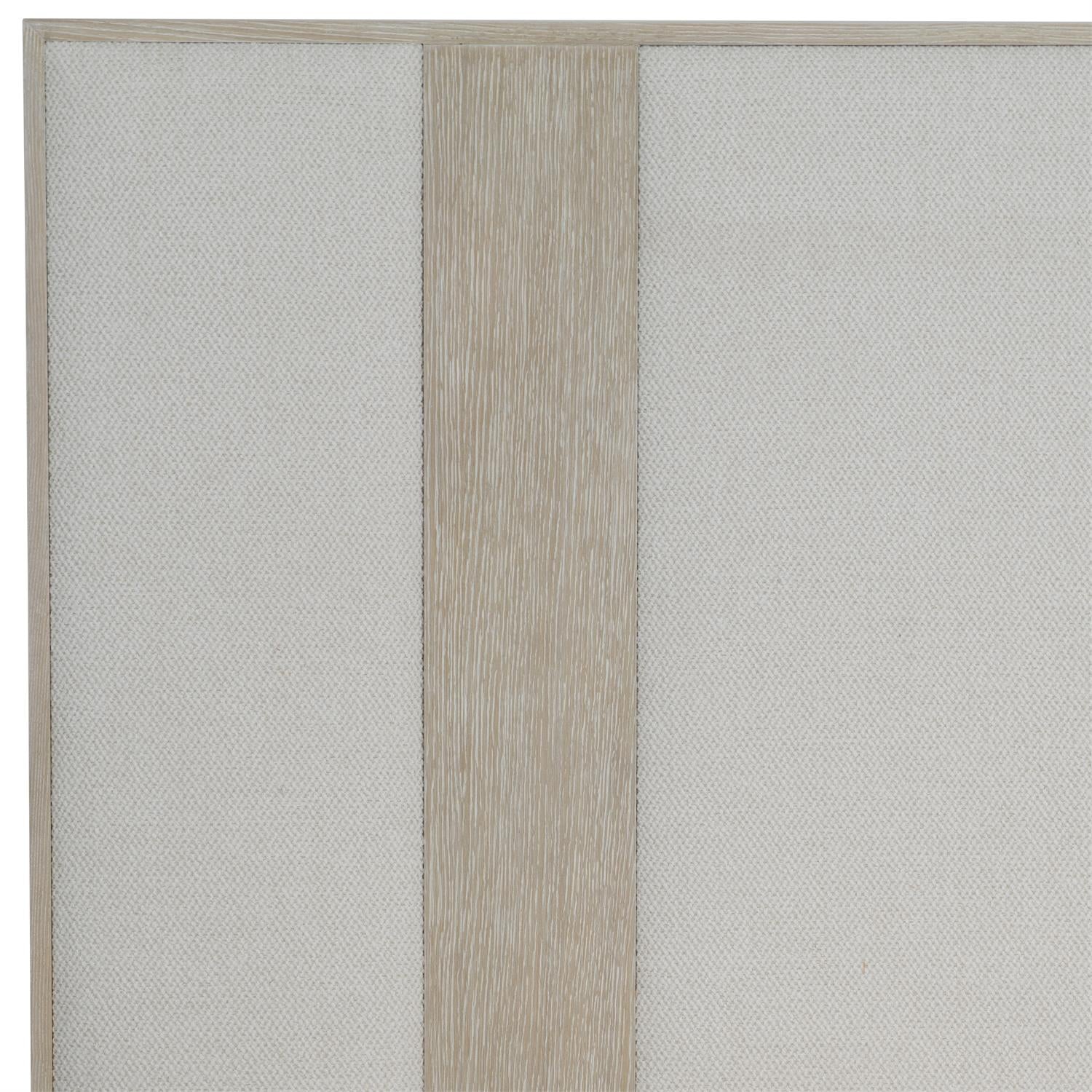 The Solaria panel bed combines the clean lines of minimalism with layers of texture in a tonal palette of natural hues. The headboard and footboard take on a geometric pattern with three inset upholstered panels and two wood vertical panels featuring quartered white oak veneers in a Dune finish. The relaxed and unpretentious bed offers an elemental design.