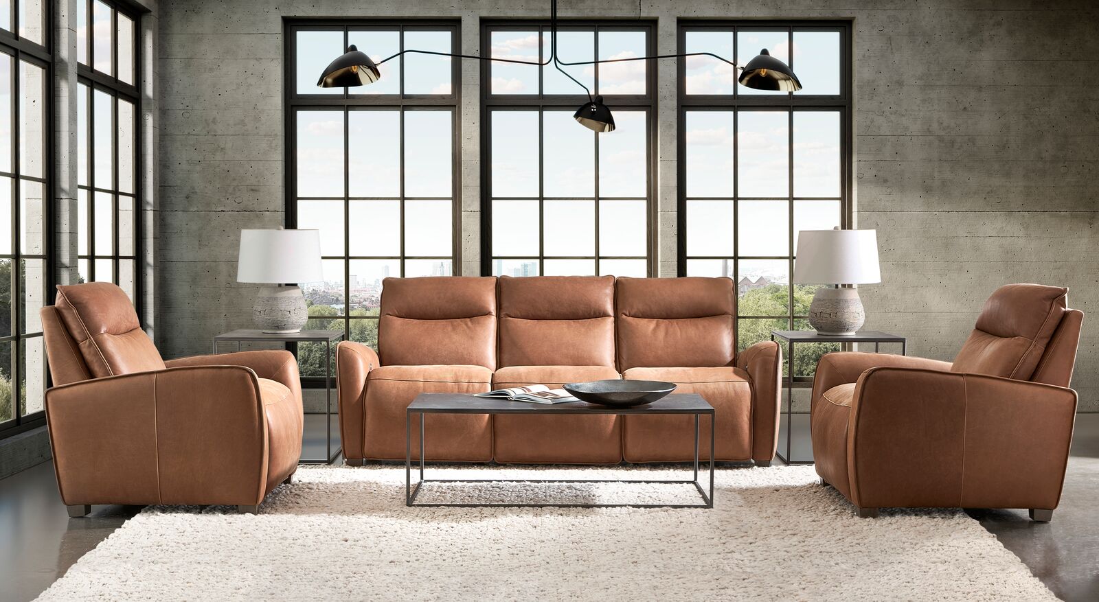 A sleek, modern shape makes a strong comfort statement for the Sorrento power motion sofa that features soft leather and plush seating.