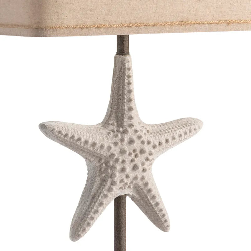 The Starfish Table Lamp will add to your coastal style of home decor. The weathered, iron, resin, base and pole holds a beautifully detailed white starfish. The cream colored, elongated, shade has a fine natural rope accent on the top and bottom of the shade. This lamp comes in a set of two and stands at 26.5-inches tall.