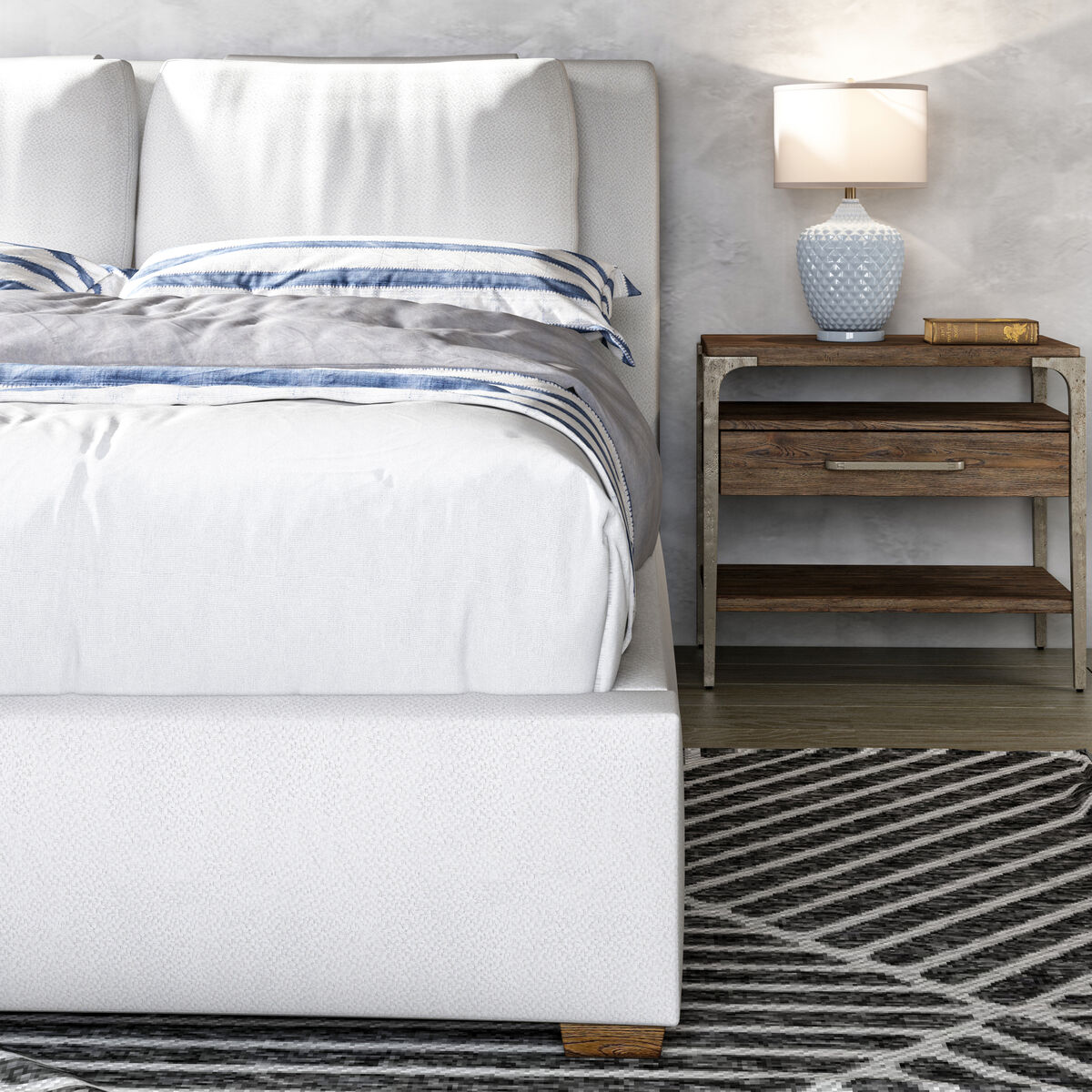 Dream of your next adventures with this stylish nightstand beside you. Two shelves and one drawer provide just the right amount of storage for bedside necessities, presented in a rustic contemporary style. The legs are crafted from sturdy metallic cast resin, while the ash solids and oak veneer are finished in a warm, oiled oak style.