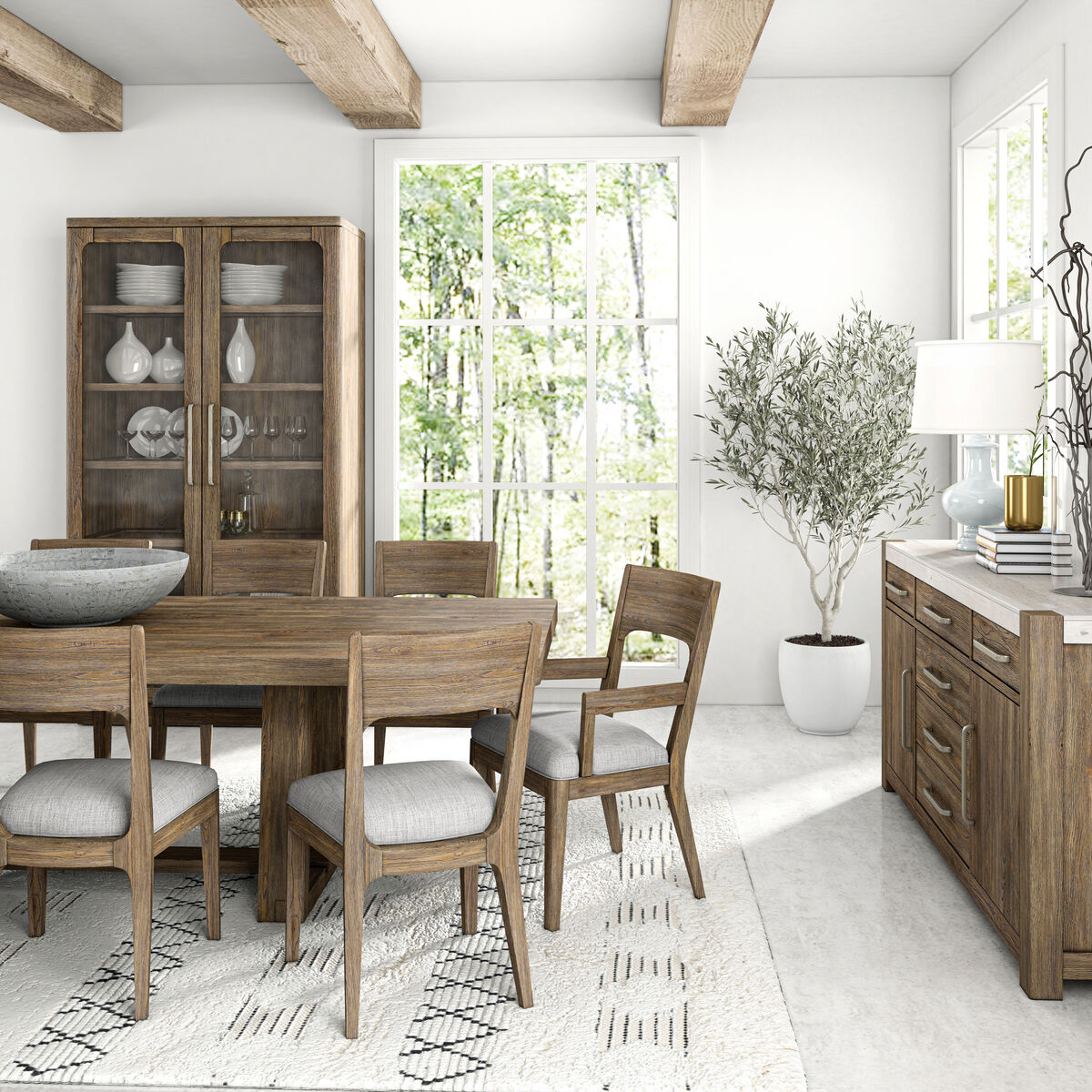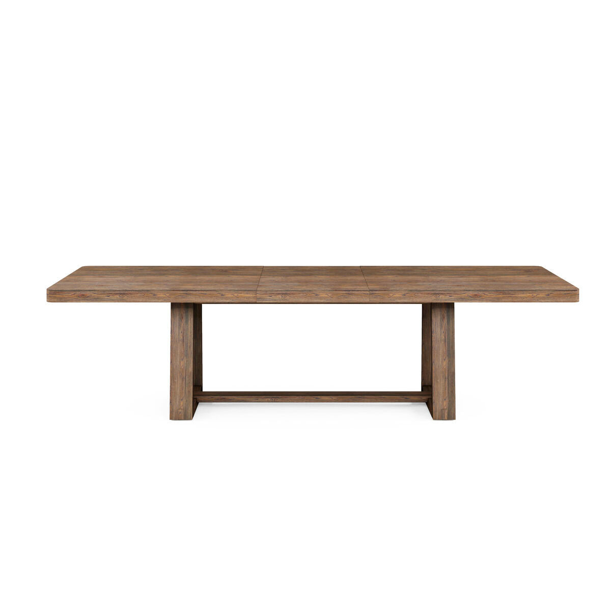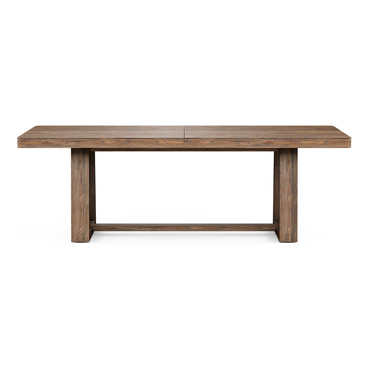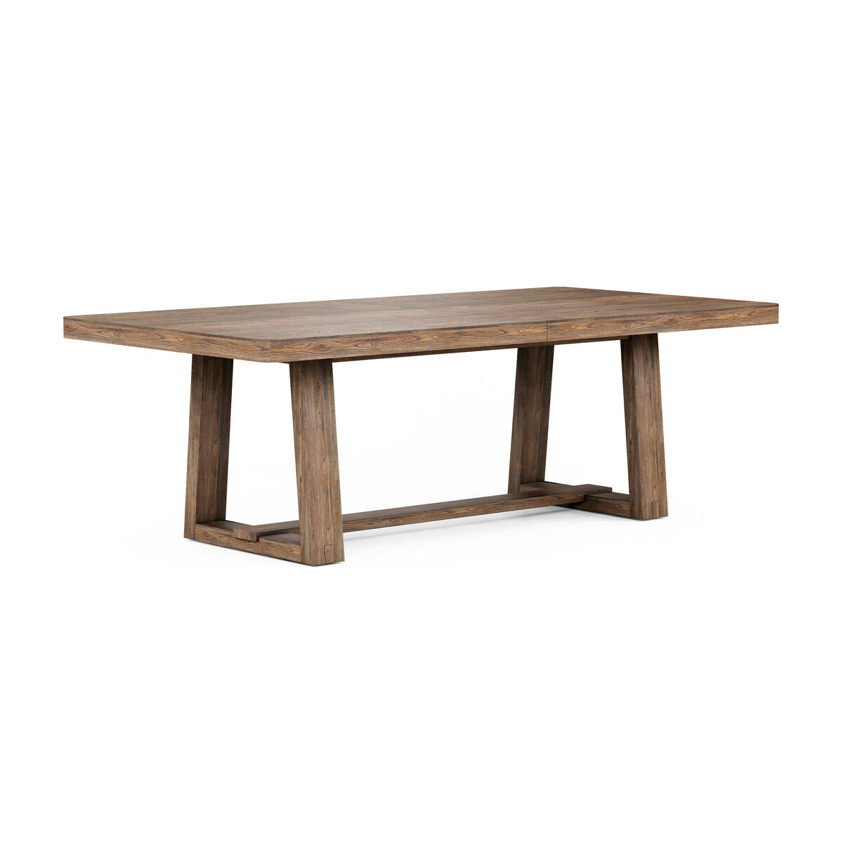 Simply bold and beautiful, the generously proportioned Stockyard dining table is as perfectly suited to family dinners as it is to lavish entertaining. Its angled trestle base creates visual interest and architectural appeal from the ground up, supporting a spacious dining surface that can comfortably seat up to eight. The 90" top can be extended to 114" with a removable leaf, and is finished in a warm, oiled oak style veneer.