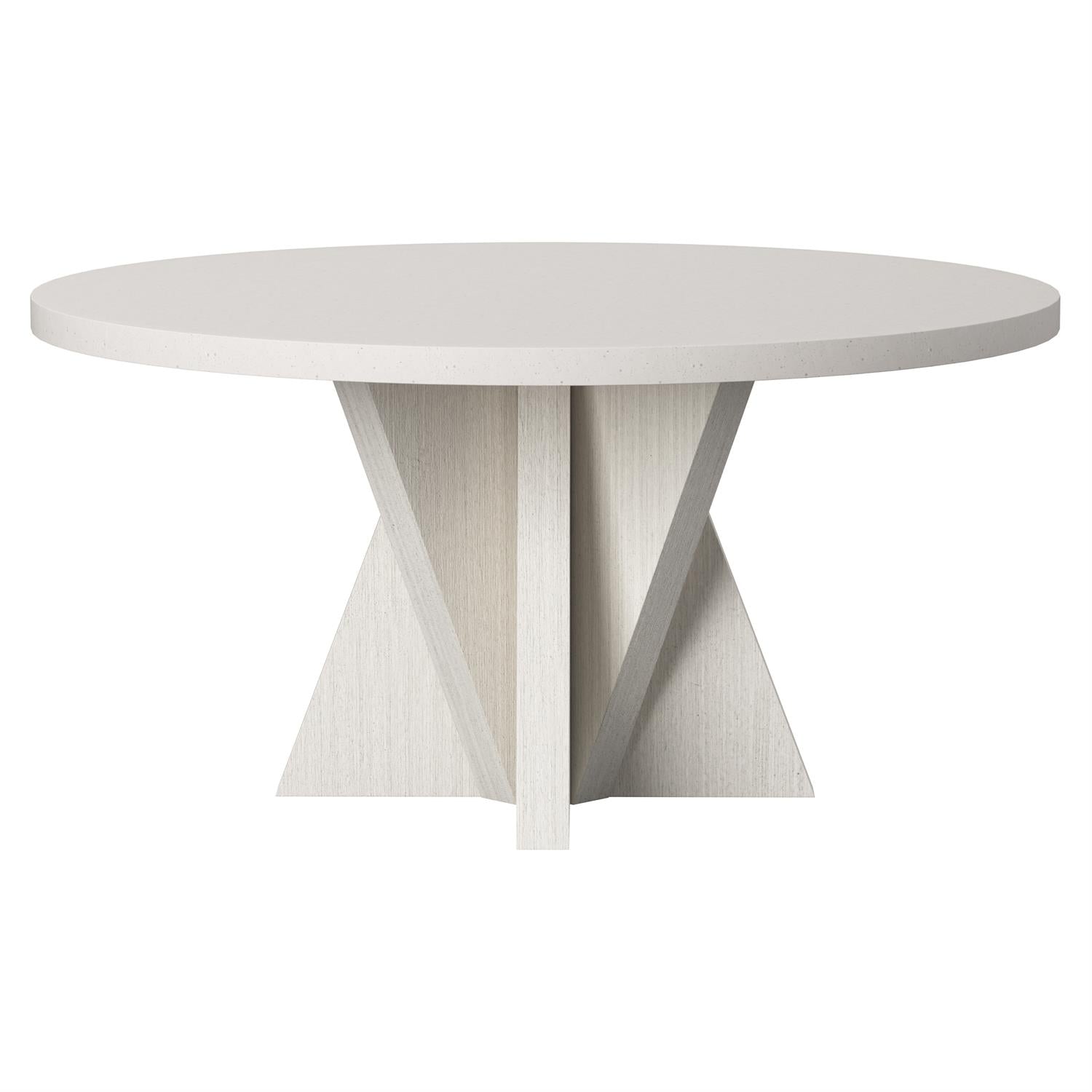Bisecting planes are perfectly placed on the Stratum dining table, creating an origami-inspired base. Triangular panels meet at the center in a unique shape to support the Fossil faux stone round top. The sleek modern base is finished in Mist.