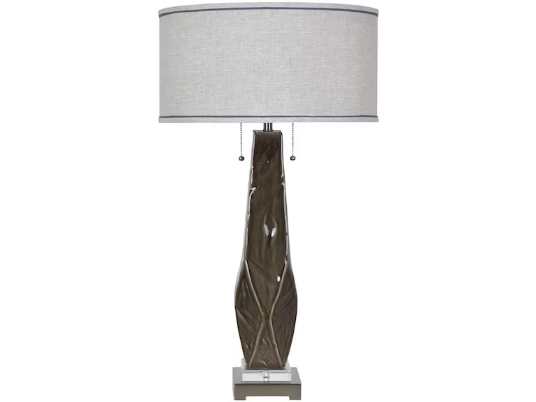 The M Décore Taylor Table Lamp has a faceted ceramic body featuring a brown finish with bronze details. The lamp sits atop a crystal sub-base with brushed nickel components that complement the design. The body lends itself to the shallow natural linen drum shade decorated with gray piping at the top and bottom. Switch the light on and off with twin pull chains on this modern and transitional lamp.