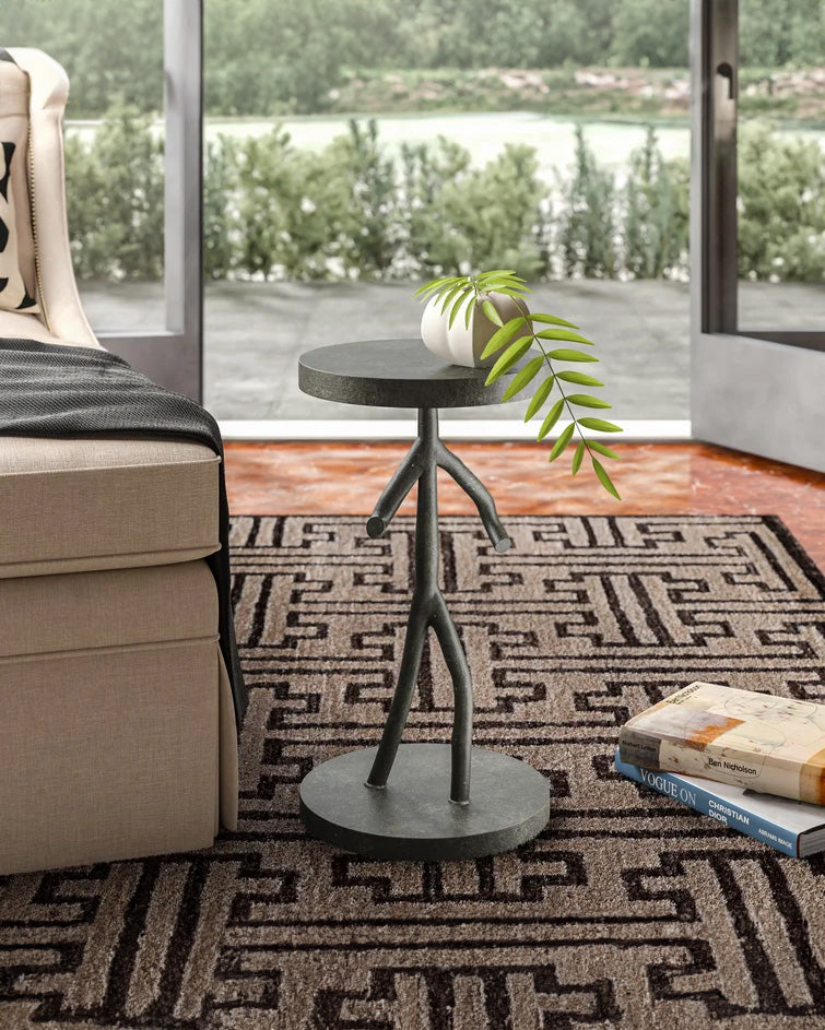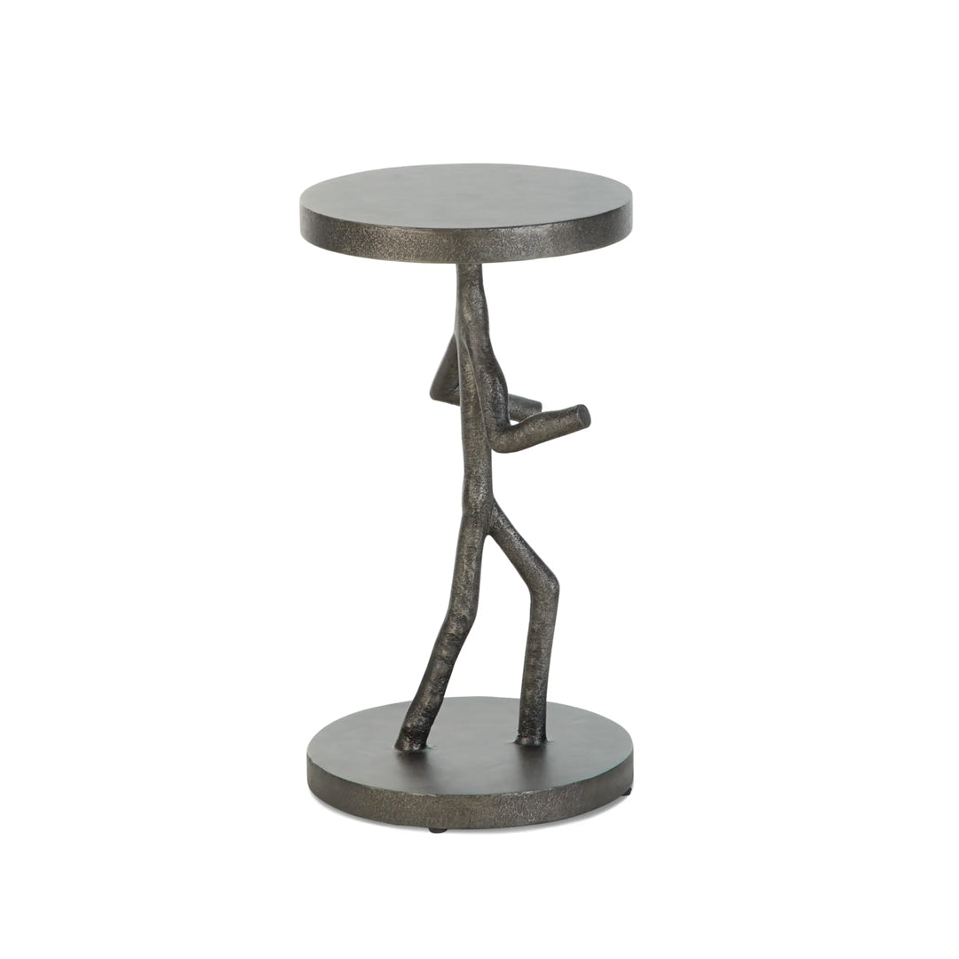Fine craftsmanship and modern styling characterize the eclectic Bernhardt Interiors collection. Embrace the abstract with the highly original Theo Figure table. A playful faux bois figure dances between a round top and base. Crafted from heavily textured cast iron, this imaginative accent table blurs the lines between modern art and furniture.