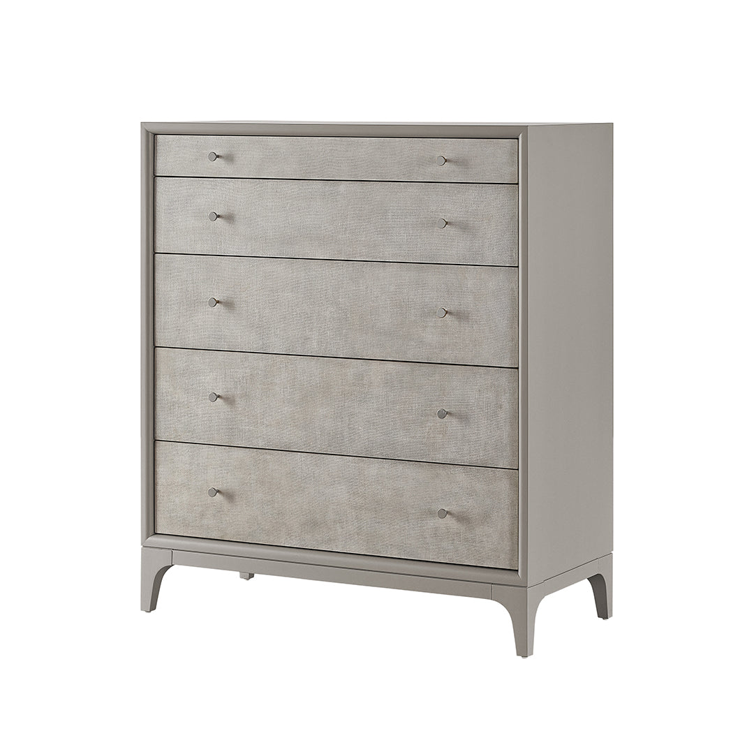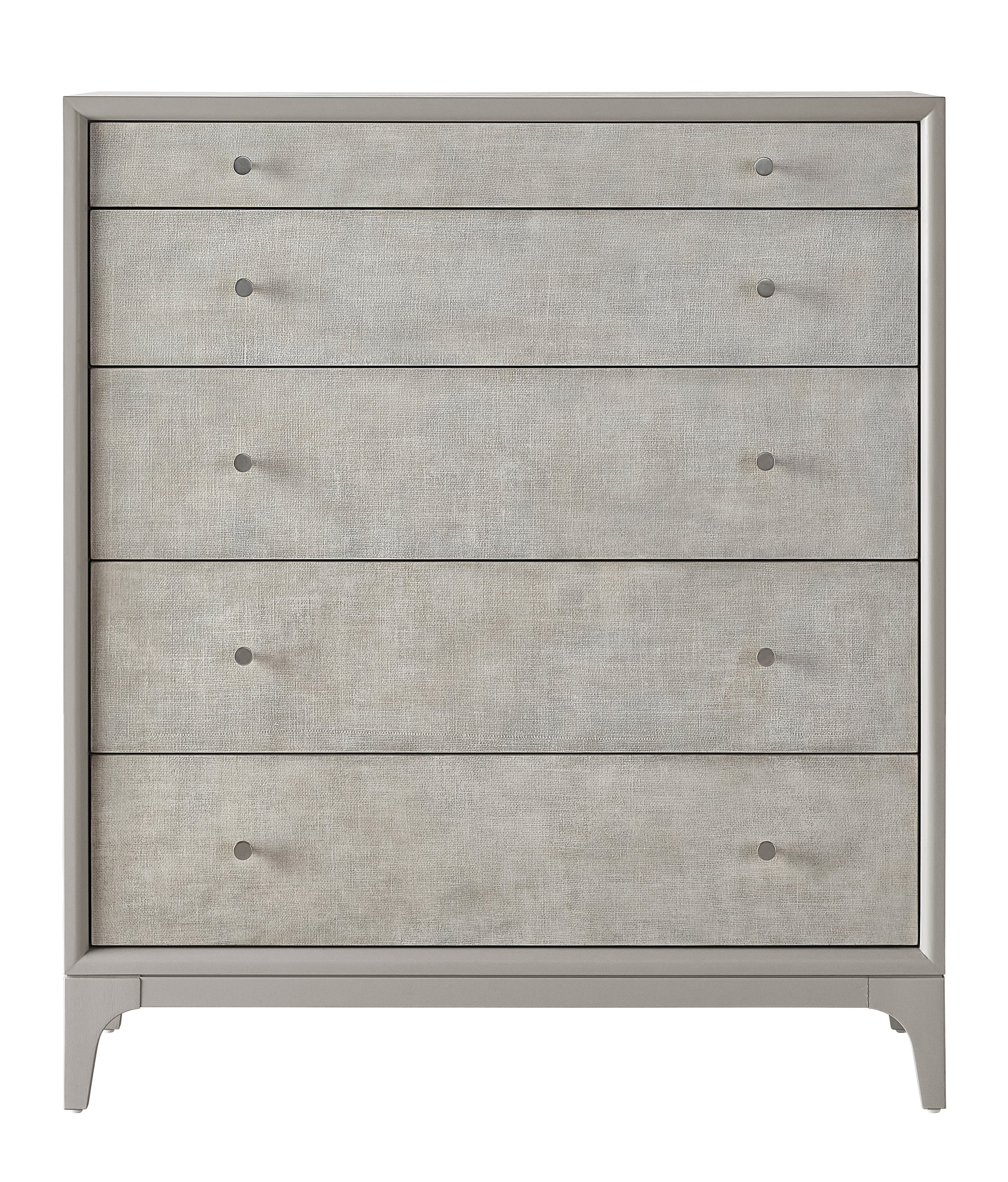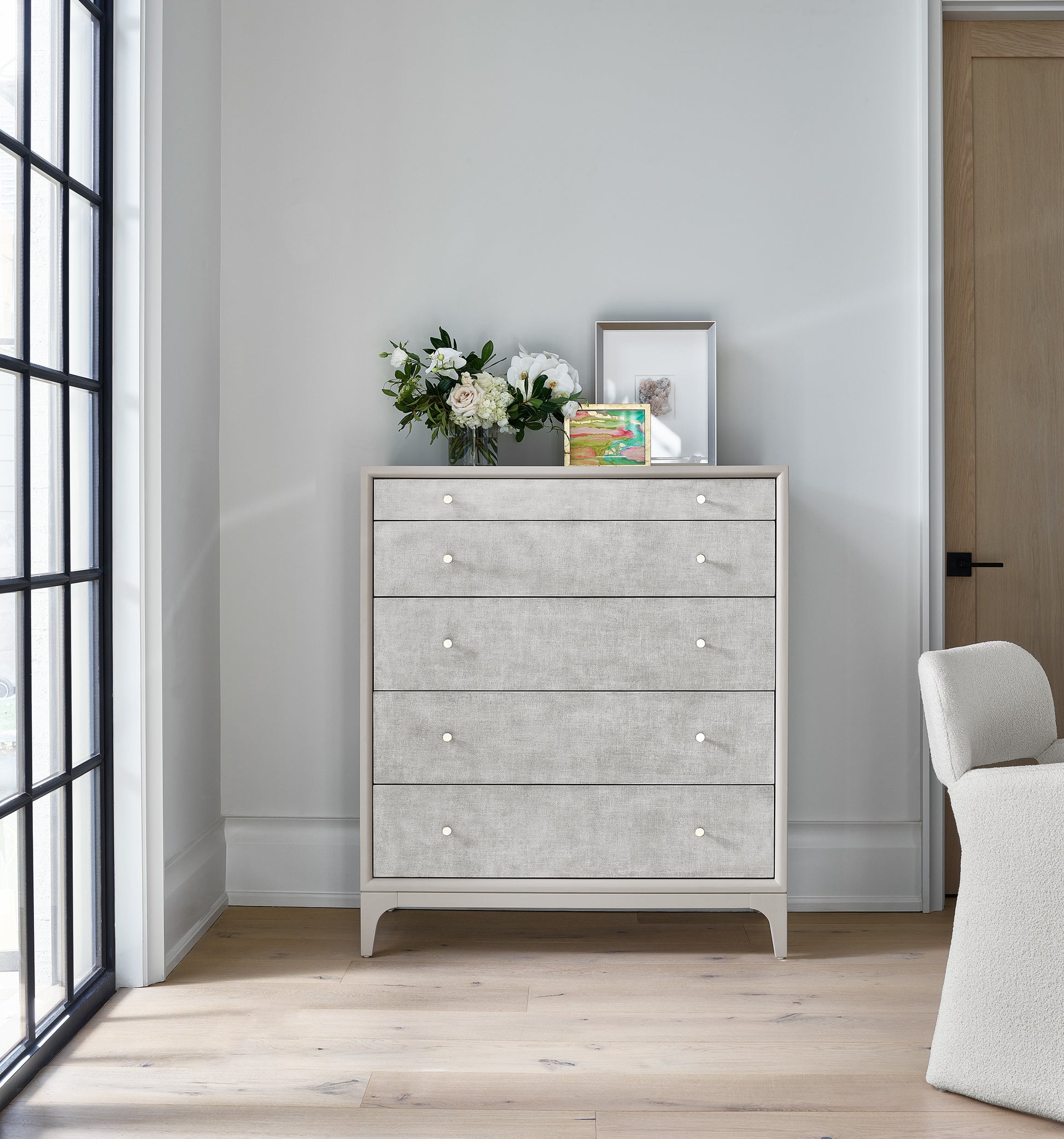 The Tranquility Chest strikes a luxurious balance between form and function featuring five spacious drawers, succinct metal pulls and an opulent linen texture finish.