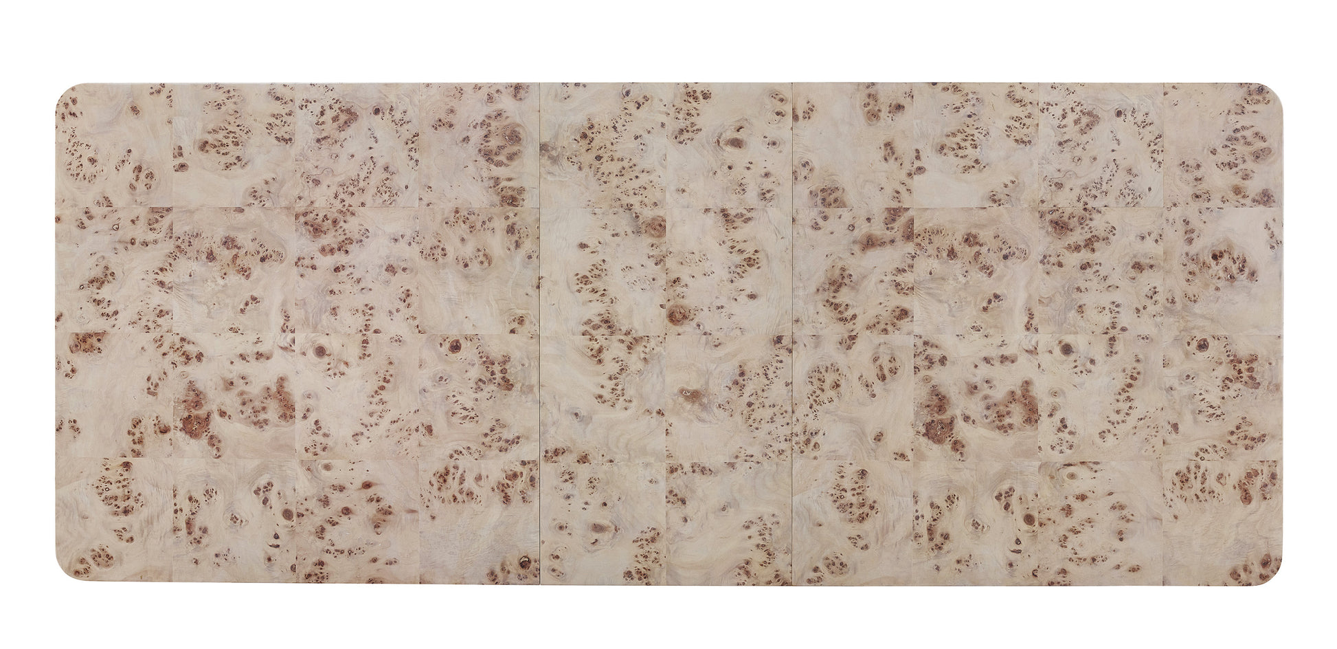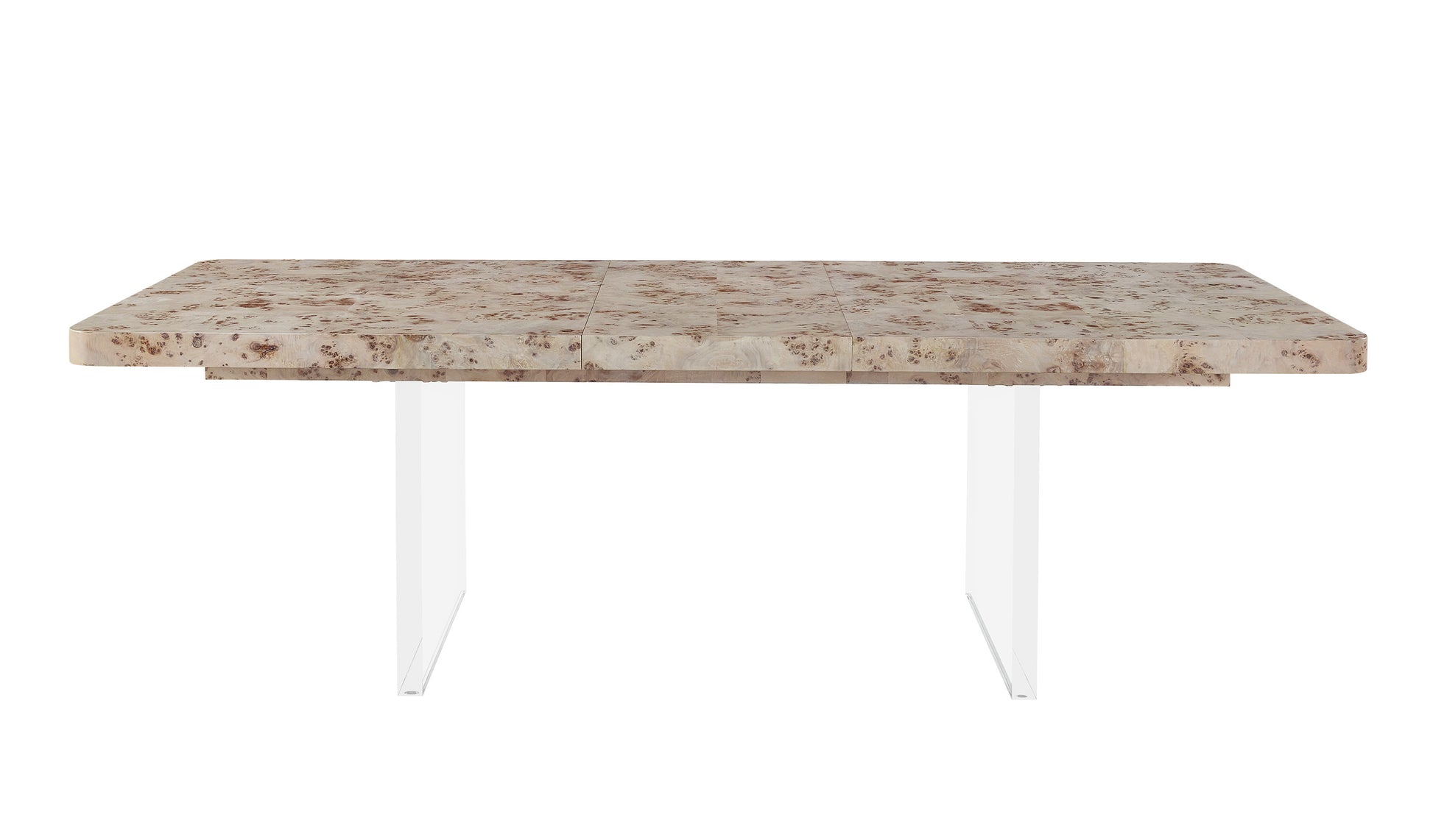 The Tranquility Dining Table serves as an opulent welcome to guests with a divine burled tabletop set atop two acrylic pedestals.