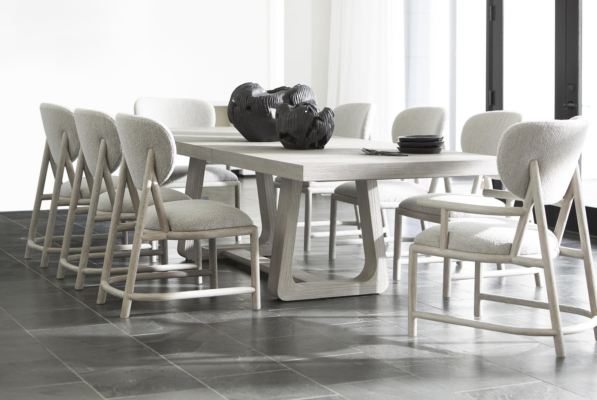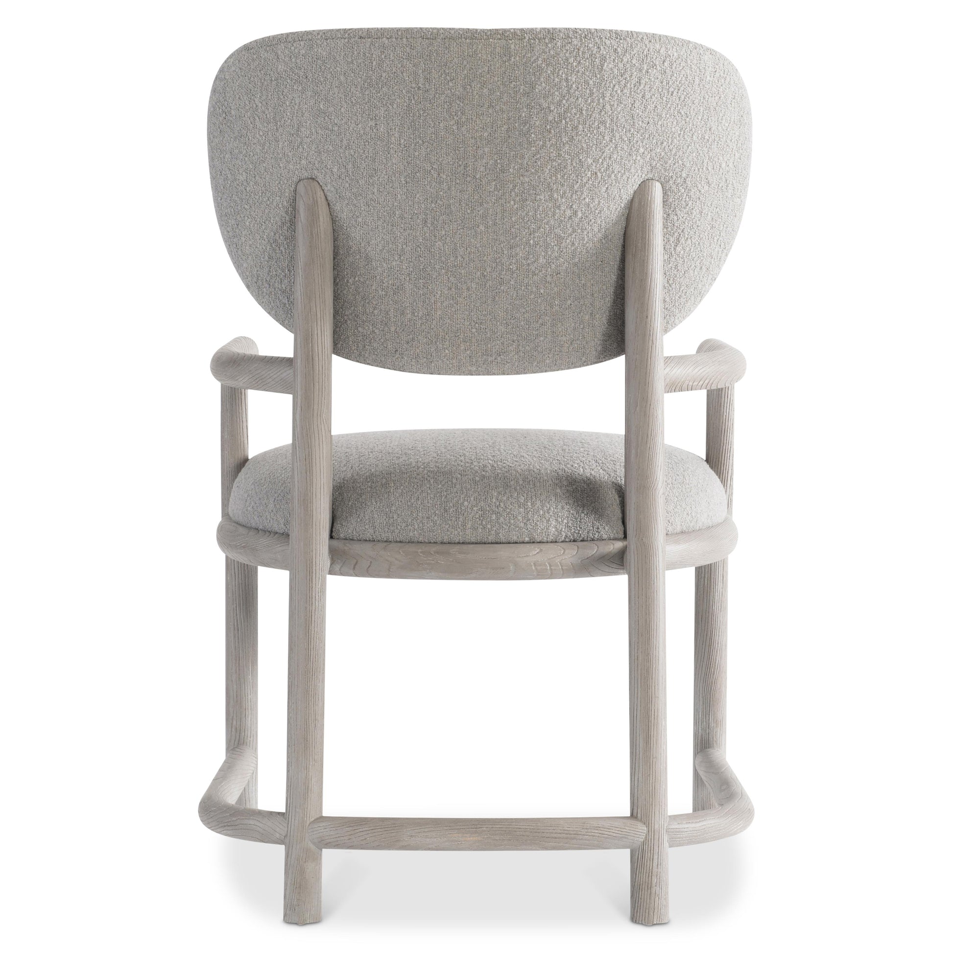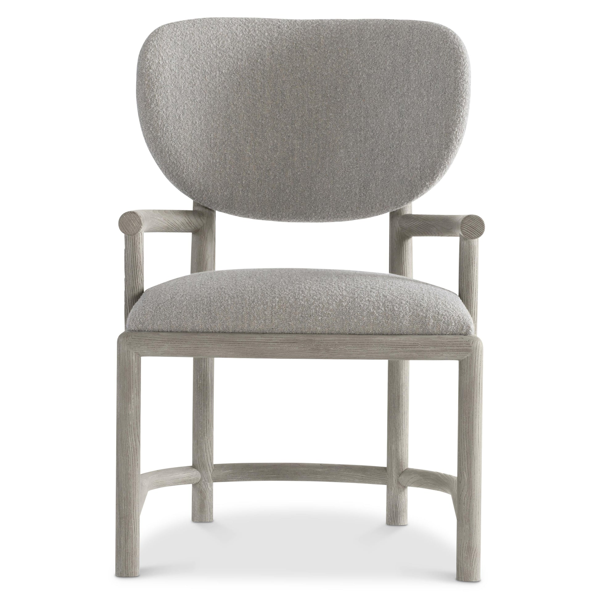 A modern organic design gives the Trianon arm chair its distinctive look. Open spaces create a sense of lightness within the bold structure of the chair's frame, including angled back legs that stretch up to the curved upholstered back. The exposed wood frame is heavily textured in the Gris finish.
