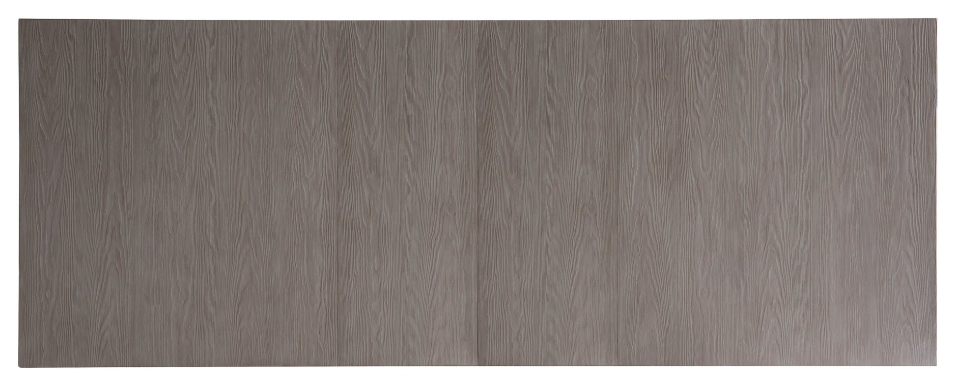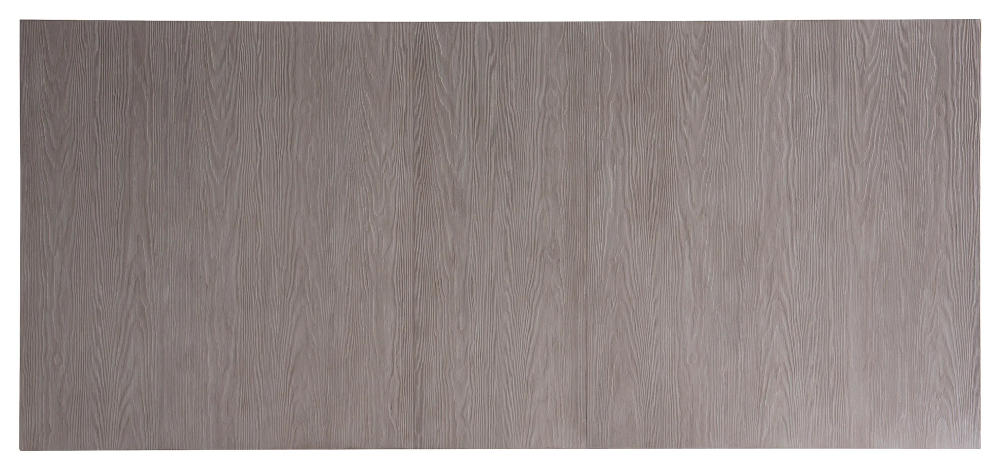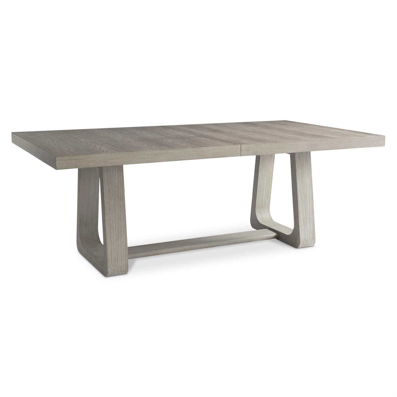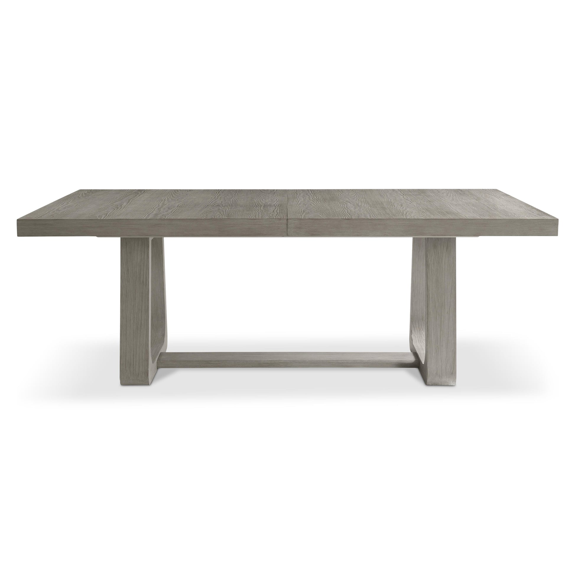 A modern rustic design takes a shapely turn in the Trianon dining table. The table has two rounded triangle legs that are connected with a center stretcher in our Gris finish. The table also extends to a generous length with the addition of two leaves.