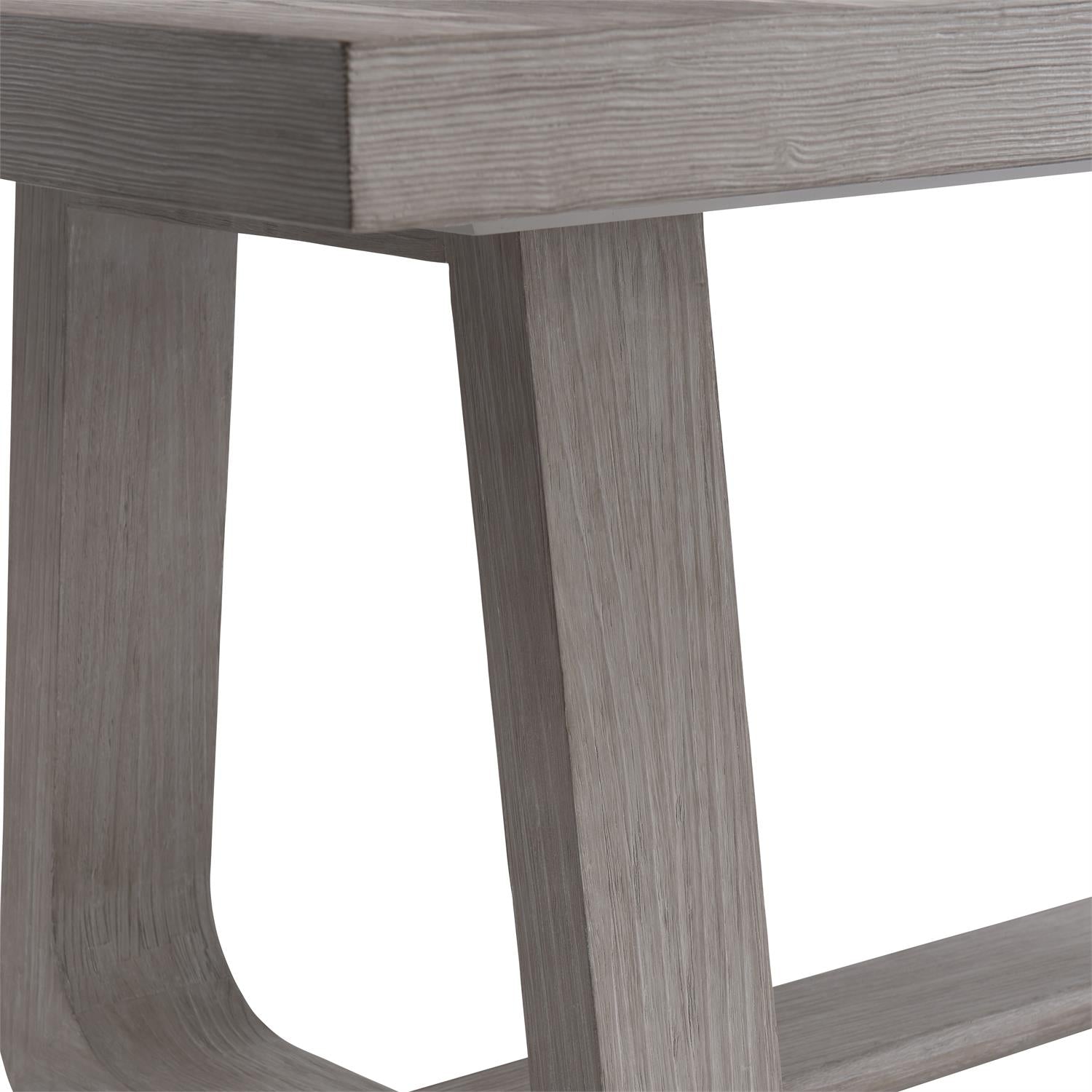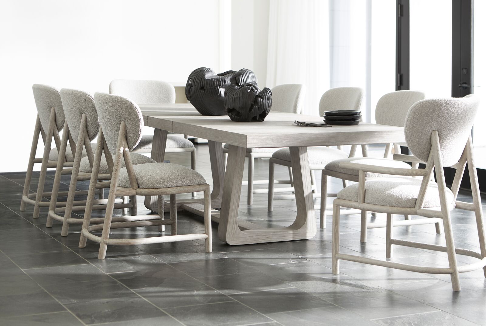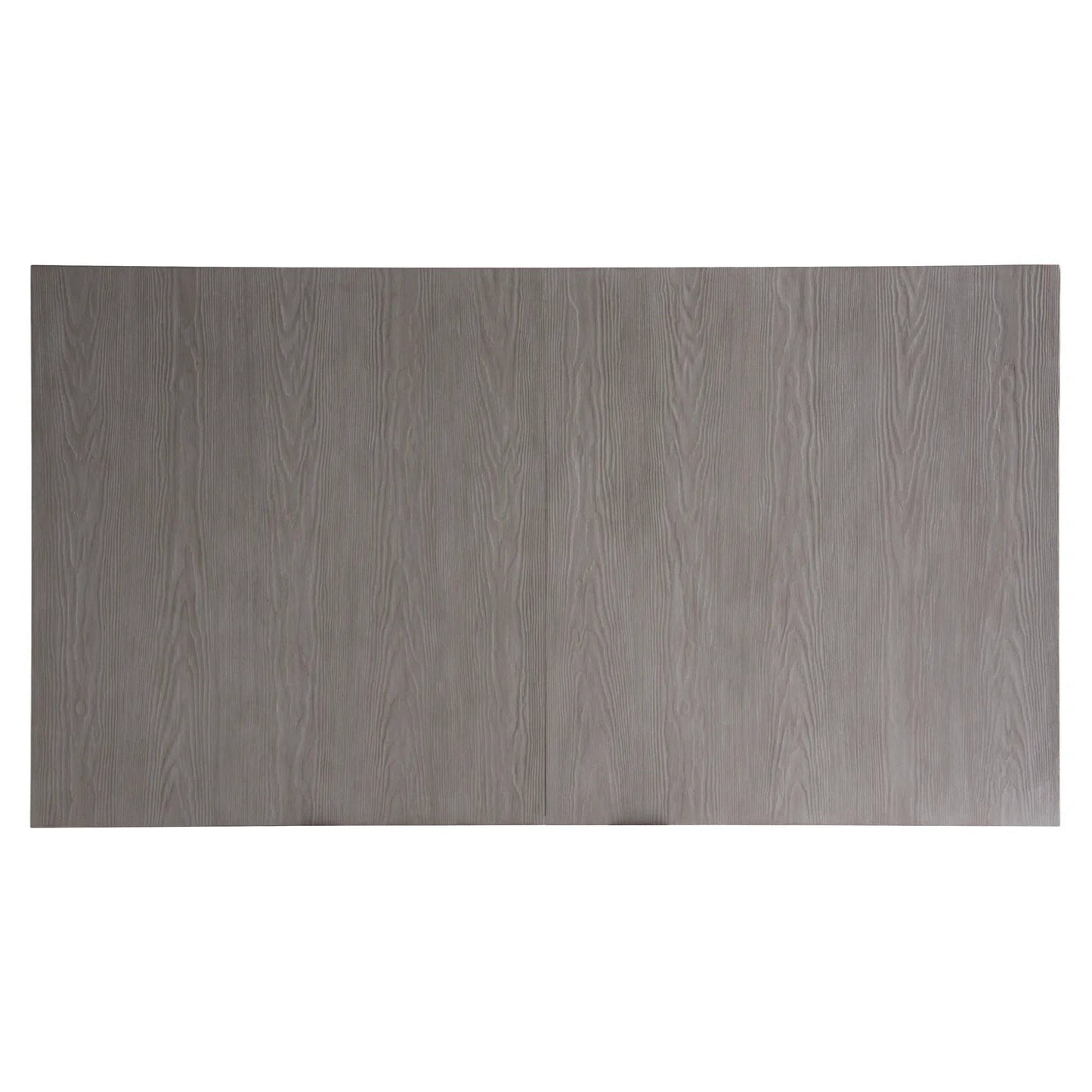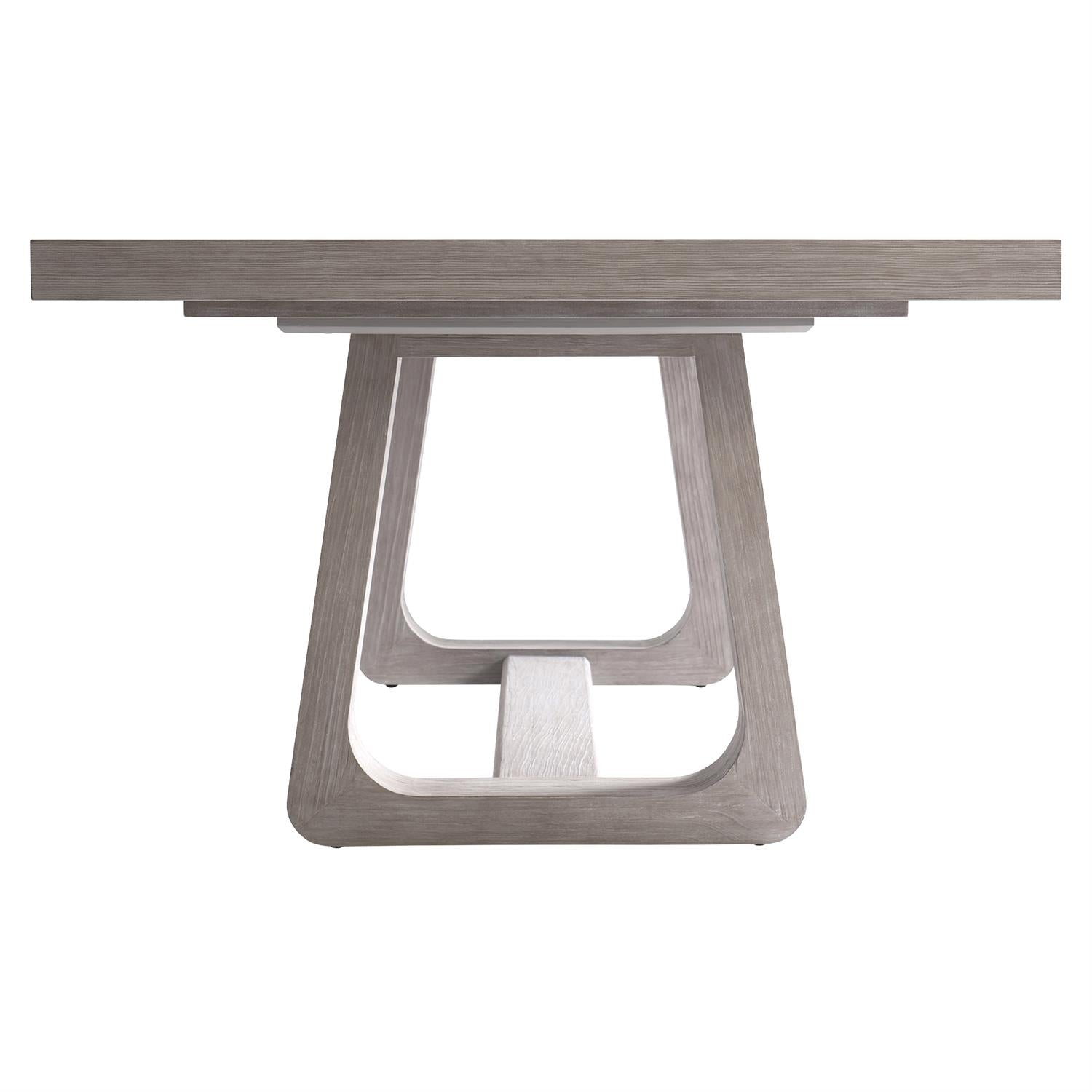 A modern rustic design takes a shapely turn in the Trianon dining table. The table has two rounded triangle legs that are connected with a center stretcher in our Gris finish. The table also extends to a generous length with the addition of two leaves.