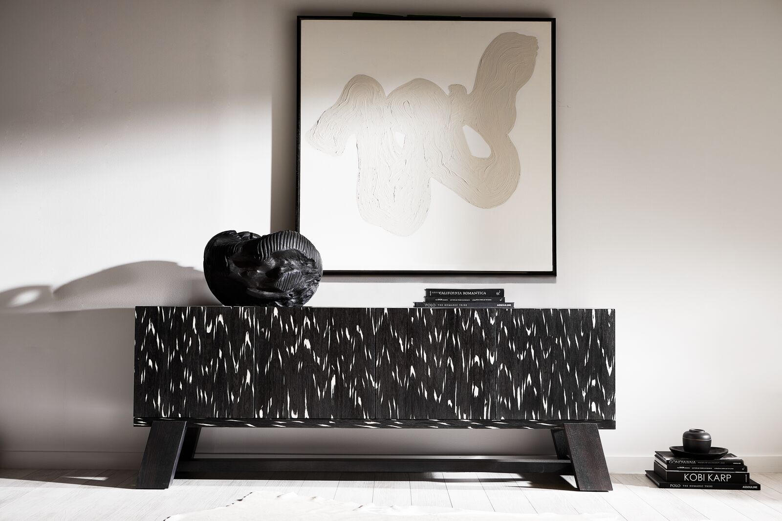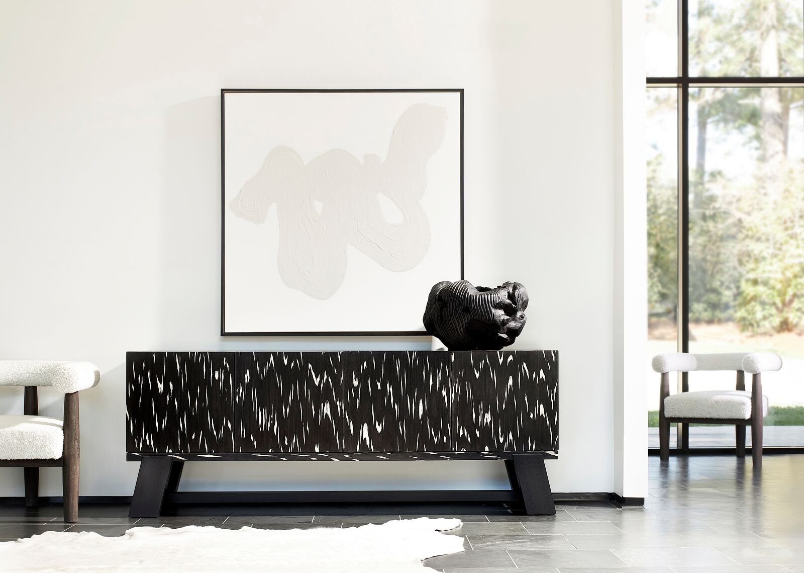 A stunningly artistic contrast finish in black and white draws all eyes to this entertainment credenza.