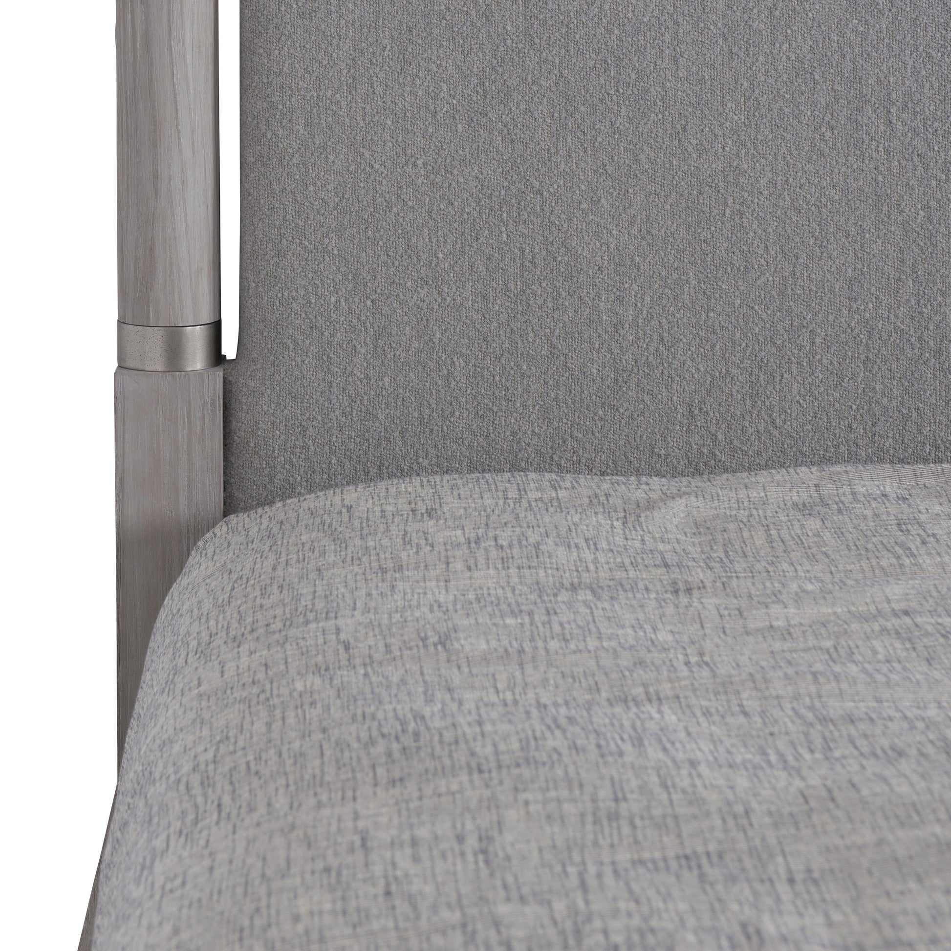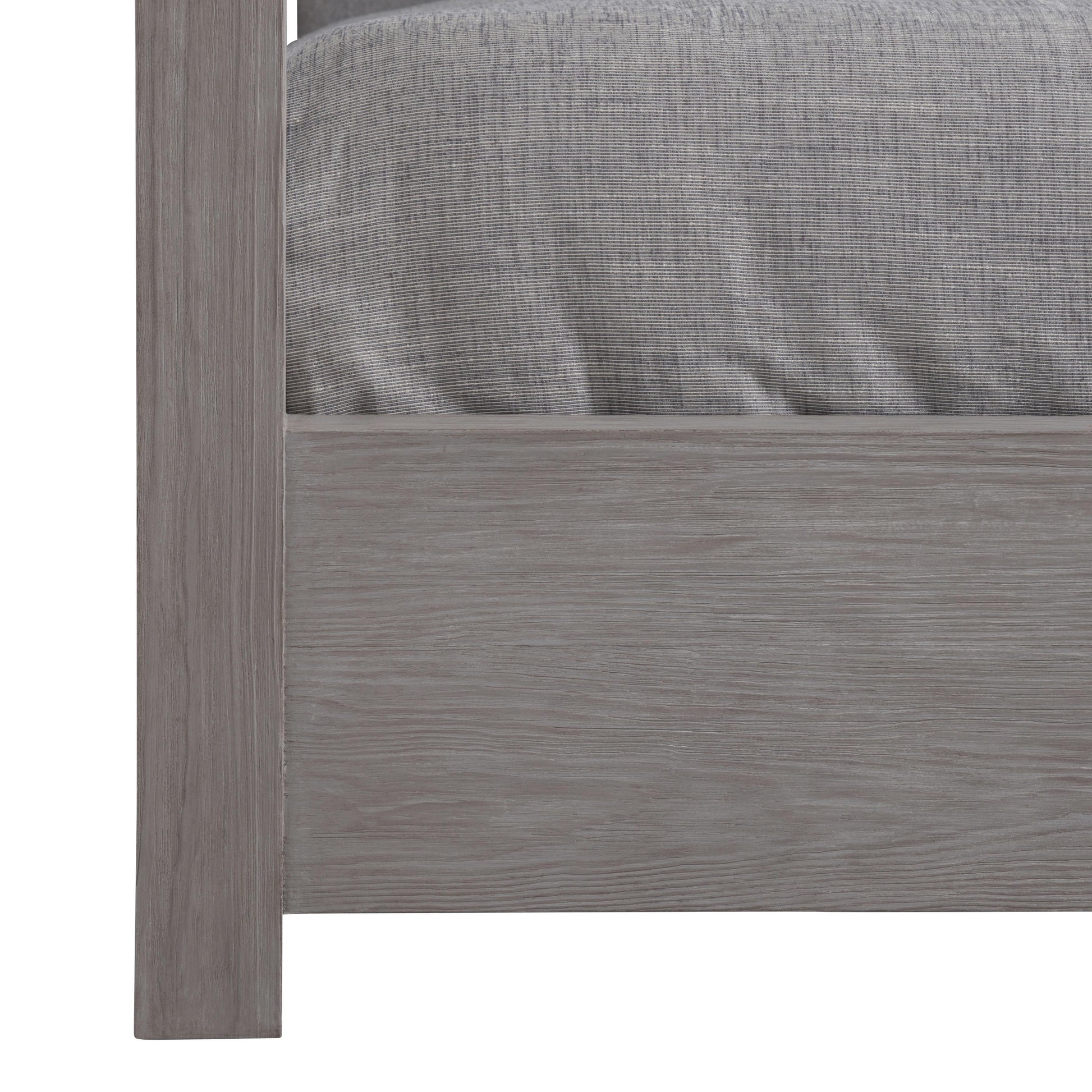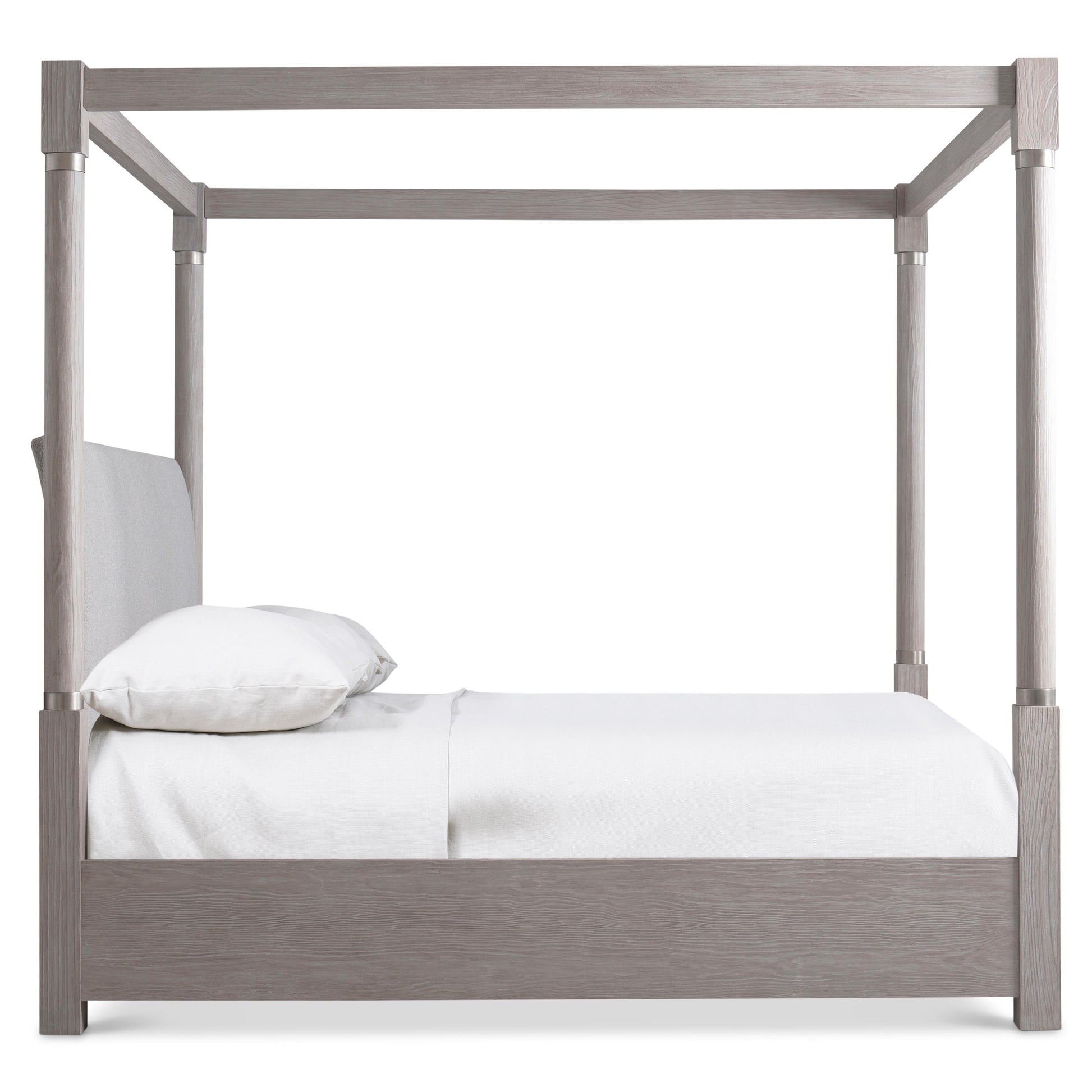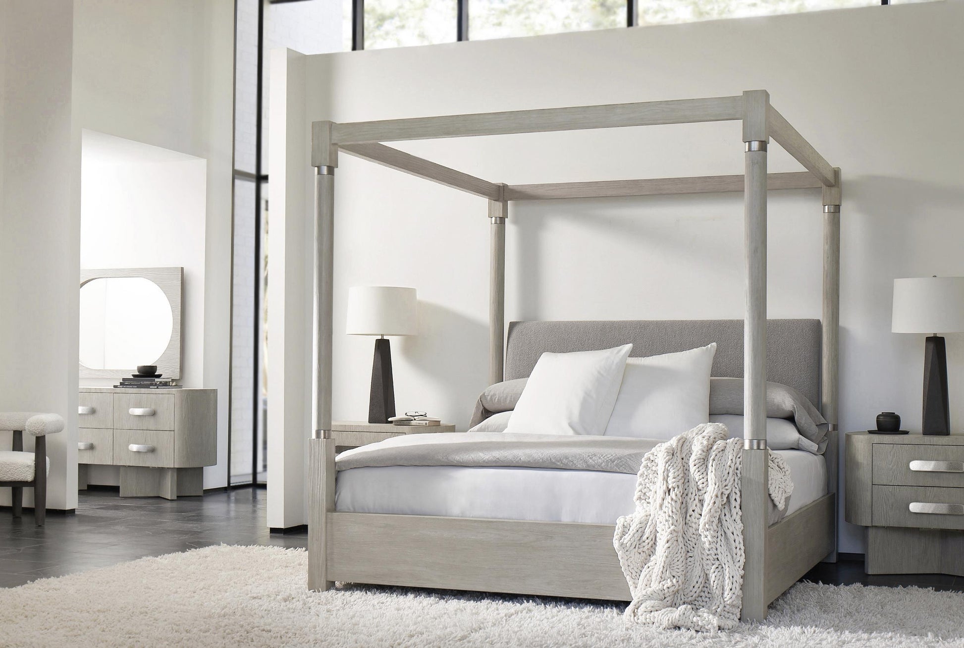 Open spaces create a sense of lightness in the bold structure of the Trianon poster bed. A mix of materials and textures are blended with refined modernism for a look that feels inspired, curated and worldly. The headboard is upholstered and supported by a wood frame in the Gris finish and each post is banded with metal in the Argent finish.