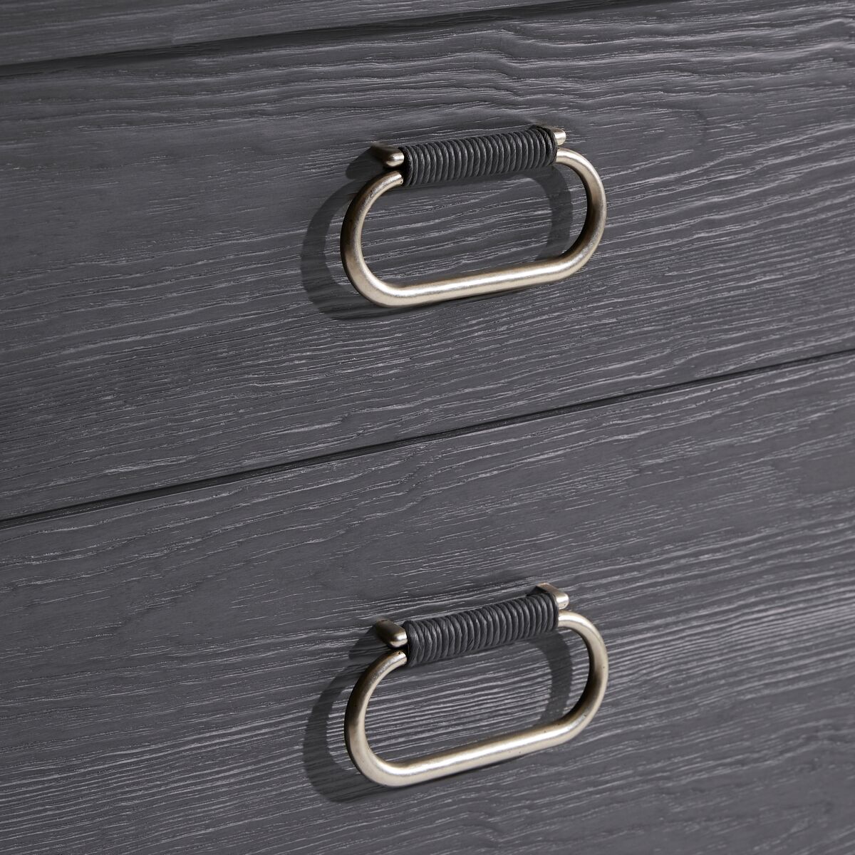 - Metal drawer pulls are cord wrapped at top of pulls
