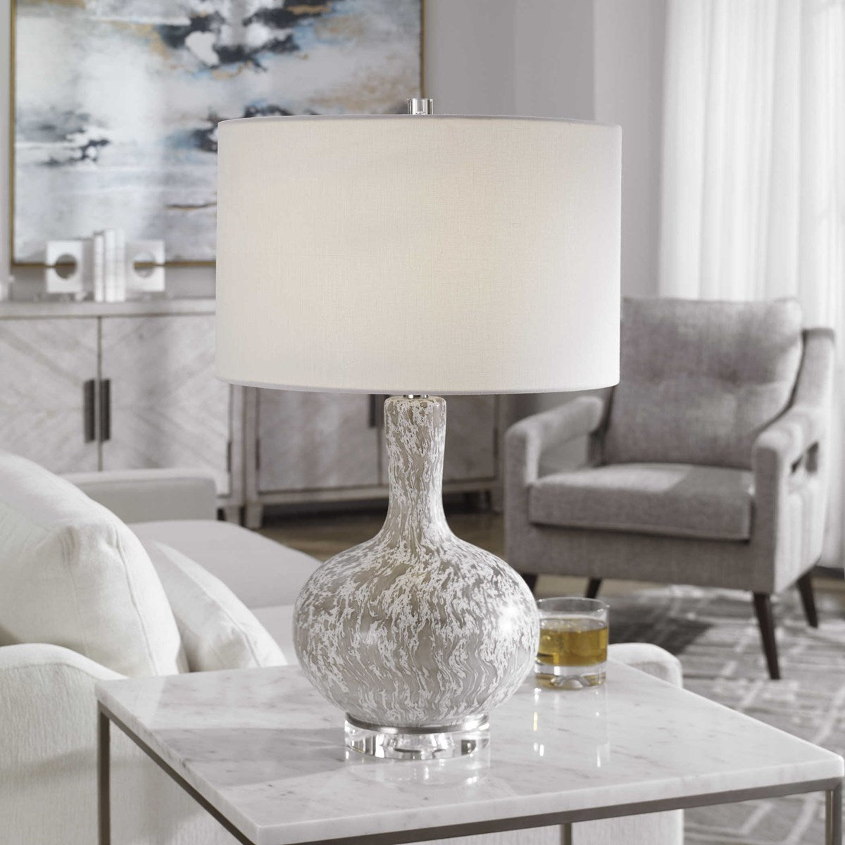 This glass table lamp features a timeless shape finished in a distressed white with a myriad of black and gray flecks, accented by a thick crystal foot and brushed nickel plated details. A white hardback drum shade completes the look.