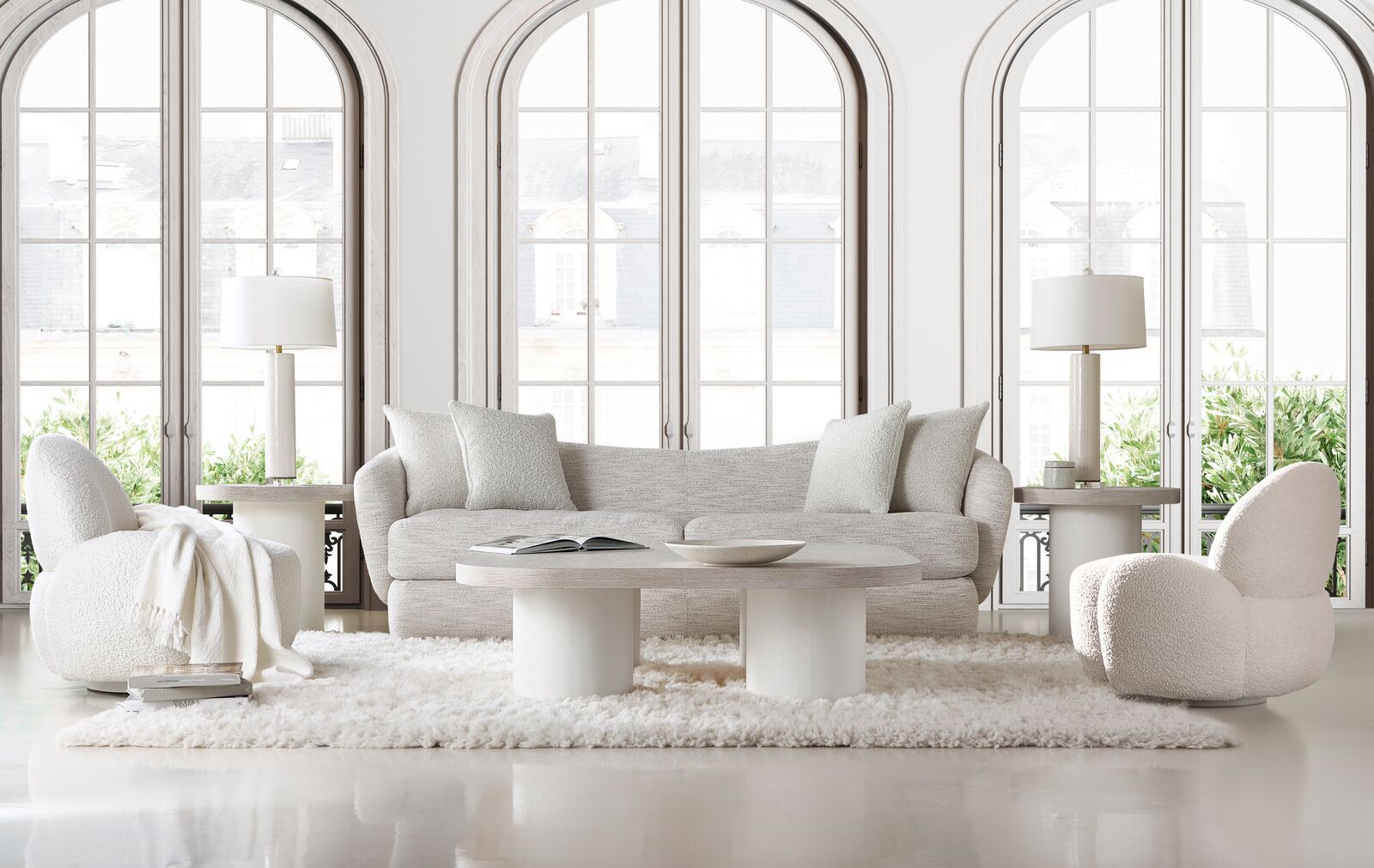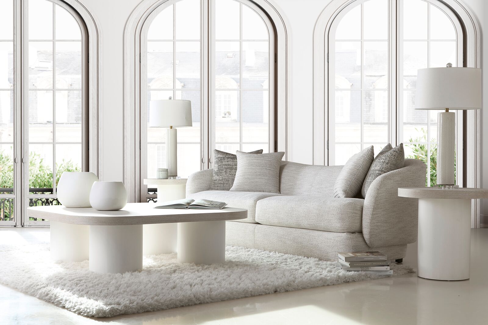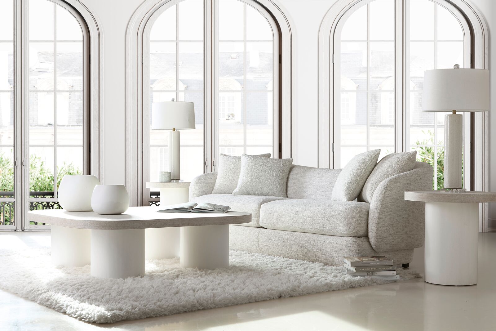 Shape and simple styling offer an uncomplicated form for the Turo cocktail table. Four cylinders form the legs in Fossil finish, supporting a rounded square, wire-brushed oak top in Bone finish.