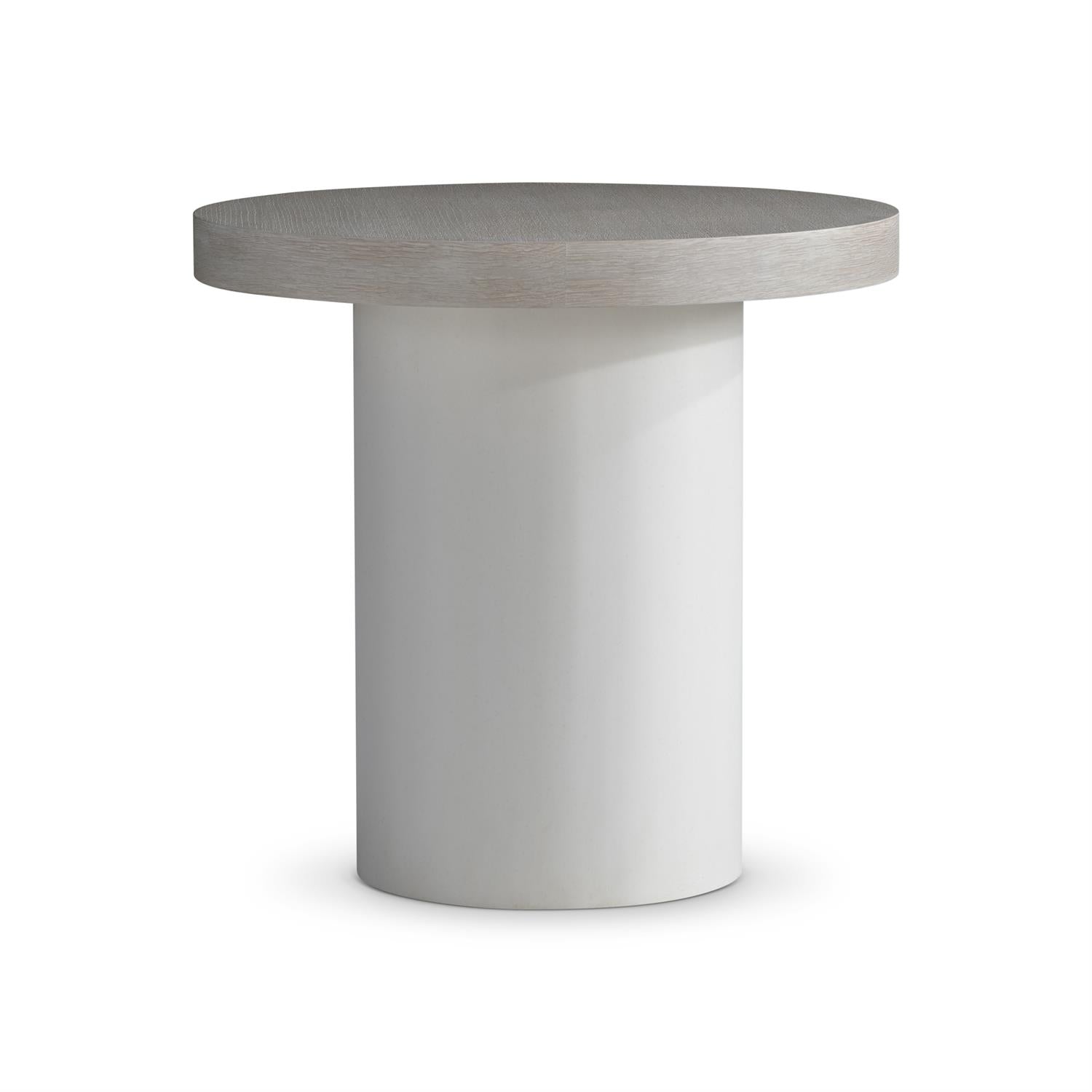 - Table top of oak solids and veneers in Bone finish atop cylinder-shaped base in Fossil finish.