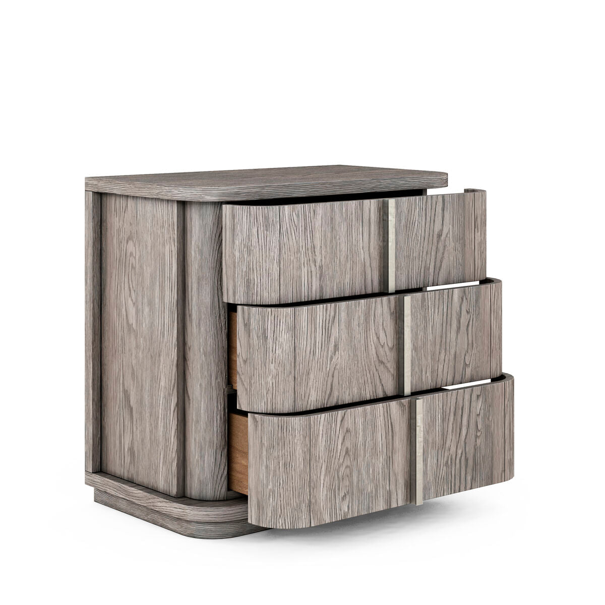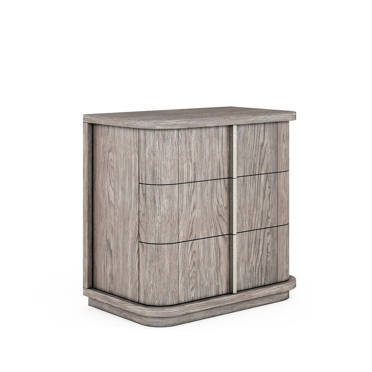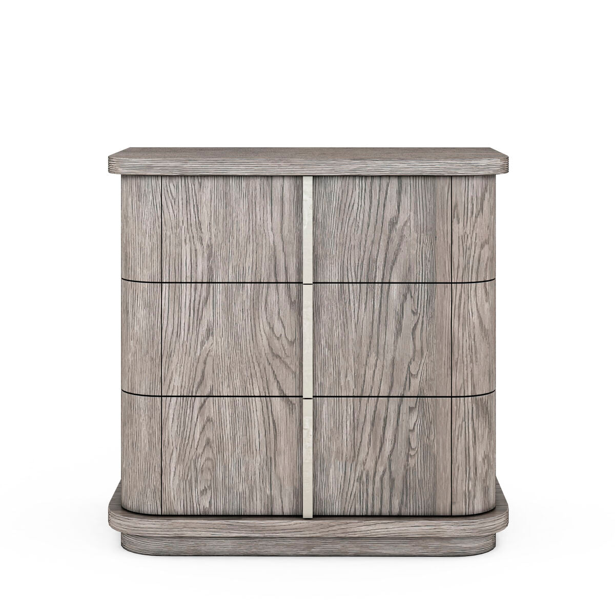 This compact chest is a small but stylish addition to the bedroom, featuring strong horizontal lines softened by the rounded corners of its facade. Three drawers provide ample storage for all the bedside necessities, accented by oversized drawer pulls that form a continuous vertical element. The chest features solid poplar construction veneered in oak with a soft grey mink finish, and complementary hardware in a metallic tone.