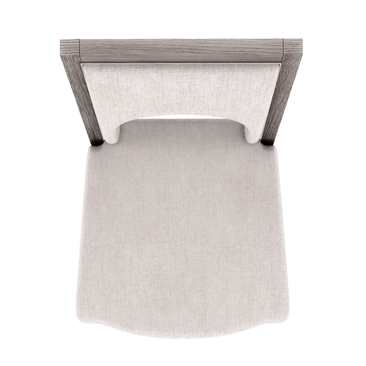 This side dining chair is inspired by the structural forms of modern architecture. Featuring the iconic arch as a central element of the upholstered back, it rests on square tapered supports that evoke strength and solidity. Crafted from solid wood, the soft grey finish is a perfect complement to finely tailored grey upholstery.